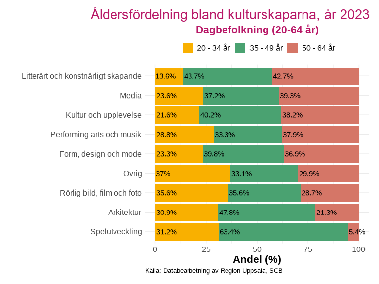 Åldersfördelningen bland kulturskaparna i länet skiljer sig mycket mellan ämnesområdena, där spelutveckling återigen har den skevaste fördelningen. 63,4 % av alla spelutvecklande kulturskapare i länet är i åldern 35 - 49 år, medan endast 5,4 % är i åldern 50 - 64 år.