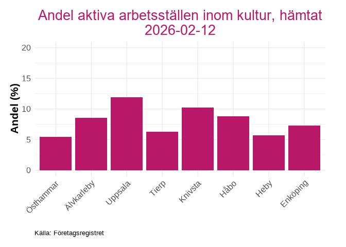 Urvalet av verksamheter som klassas som kulturverksamheter baseras på utvalda SNI-koder, i enlighet med SCB:s dokumentation och tidigare tillämpningar av näringsgrensindelningen inom kulturstatistik (Statistiska centralbyrån (SCB) (2025c)). Endast arbetsställen vars huvudsakliga verksamhet faller inom dessa koder inkluderas i analysen.