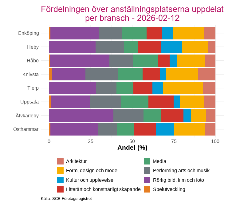 Uppsala kommun har flest antal inom samtliga branschkategorier, vilket är rimligt sett till kommunens folkmängd.