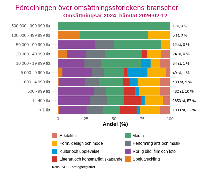 Omsättning är ett centralt mått för att förstå kulturföretagens ekonomiska omfattning och struktur. I detta avsnitt analyseras hur kulturföretagen fördelar sig över olika omsättningsnivåer och hur detta varierar mellan branscher. En del företag i länet saknar data för omsättningsår och har därför uteslutits från analysen i Figur 2.