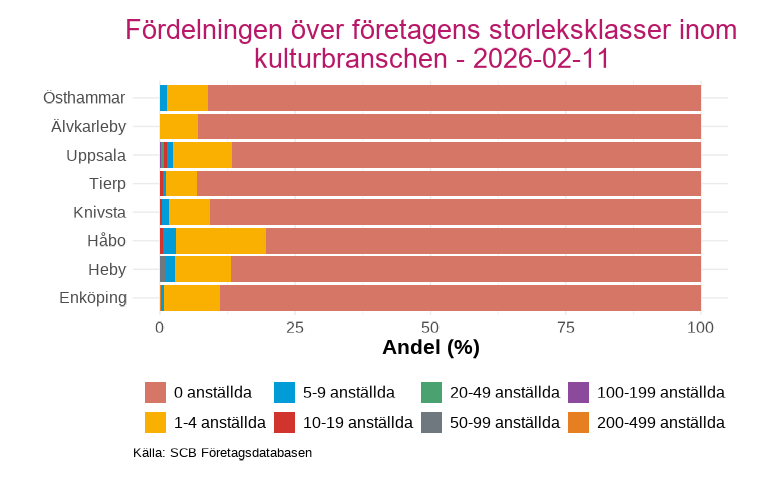 I nästan alla av länets kommuner finns det inte arbetsställen och företag inom kultur för alla storleksklasser. Noterbart för Enköping är att det saknas arbetsställen för gruppen 200-499 anställda, men att ett företag inom kulturbranschen i Enköping har den storleken. Detta indikerar att företaget har sitt säte i Enköping men att arbetsställena är lokaliserade i andra kommuner, eller att uppgifterna om arbetsställen och företag registrerats på olika sätt i företagsregistret.