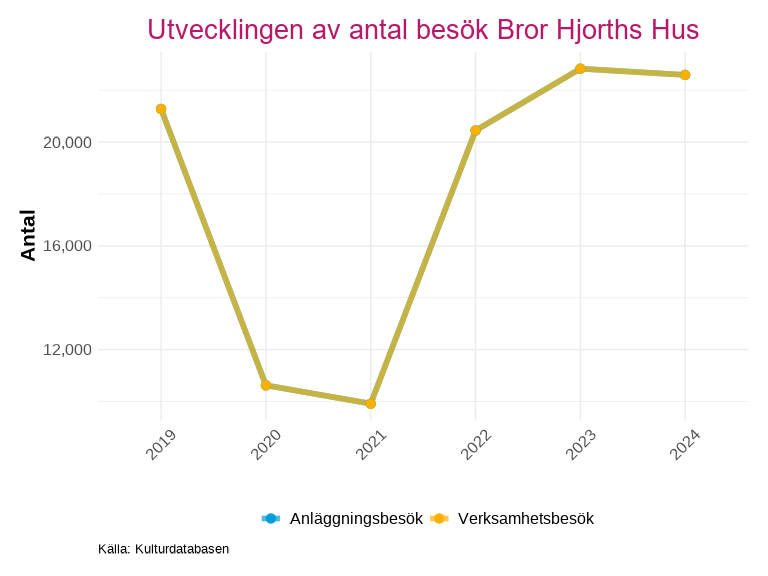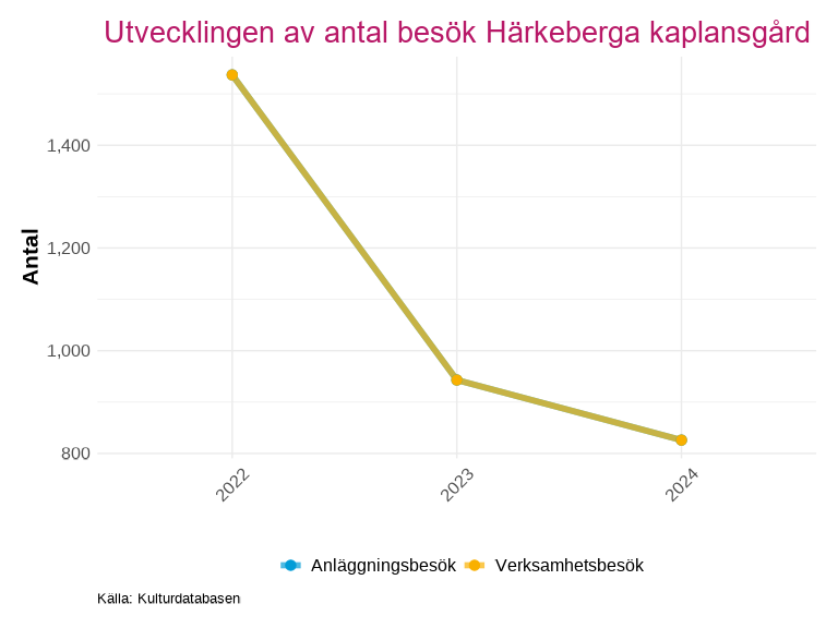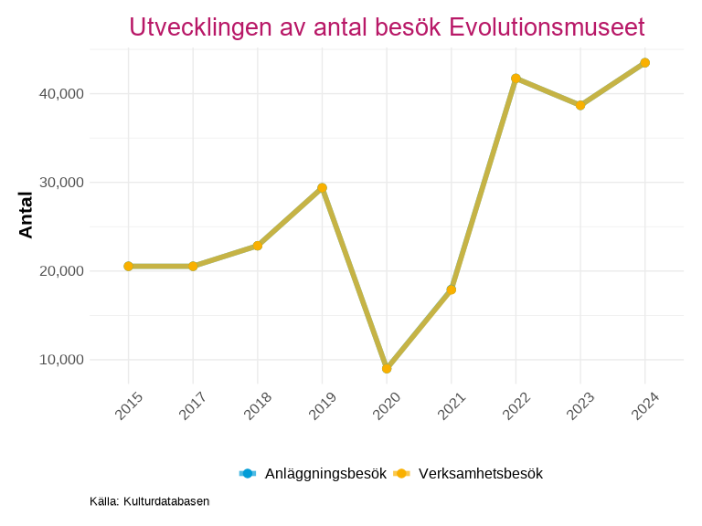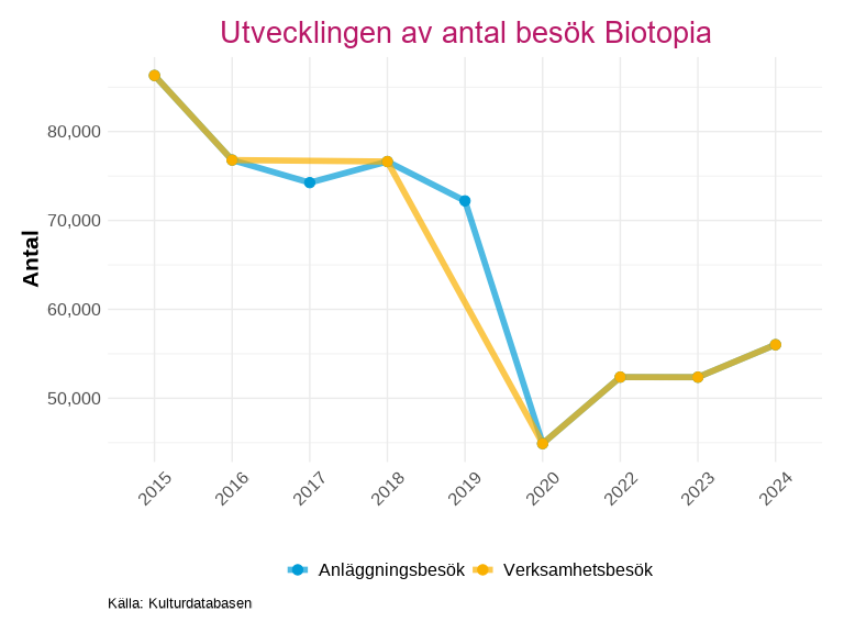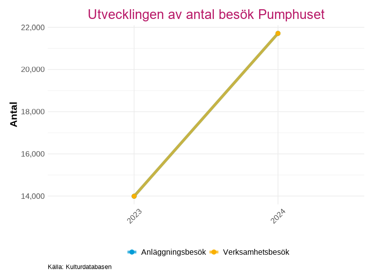 Utvecklingen visas både för anläggningsbesök och verksamhetsbesök, vissa verksamheter räknar ett besök till bägge kategorierna, vilket gör att linjerna överlappar i grafen.