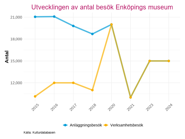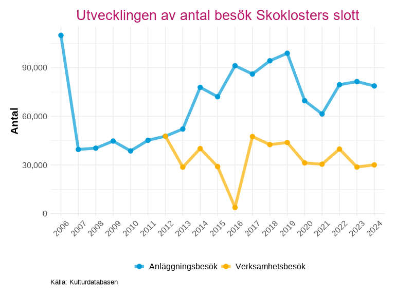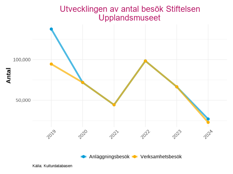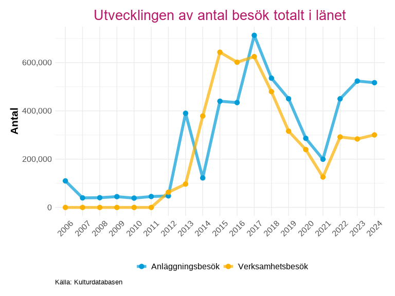 Det låga antalet fram till 2013 beror främst på brist på data från flera av länets museum, det högsta antal besök är mellan 2015 och 2017 för att sedan konstant sjunka till lägsta nivån under pandemiåren. Efter 2021 så har antal besök börjat öka, där anläggningsbesök gjort det största lyftet.
