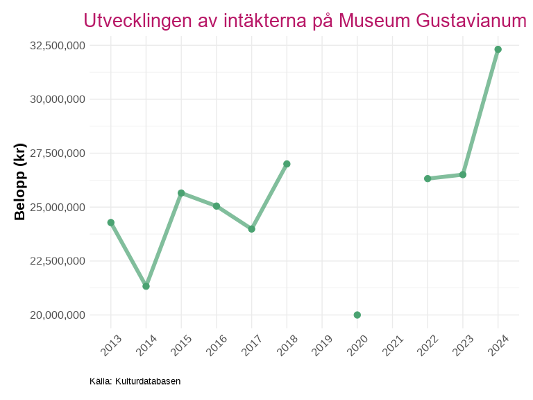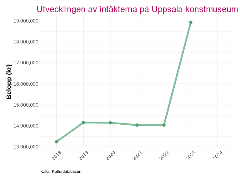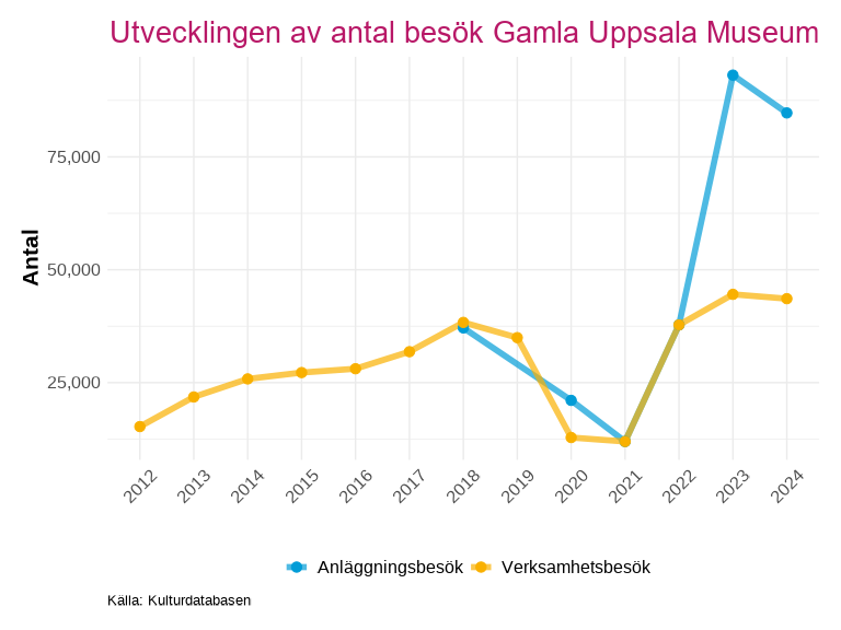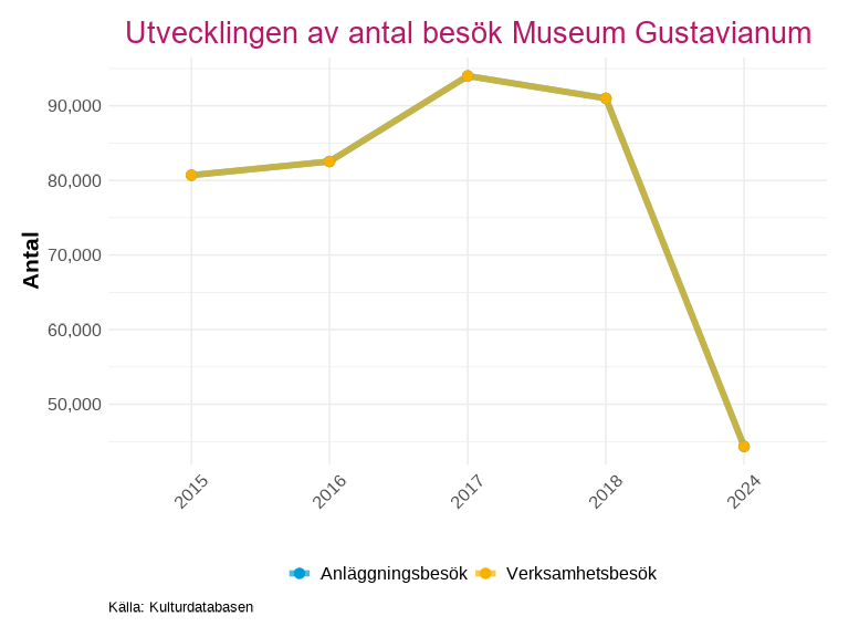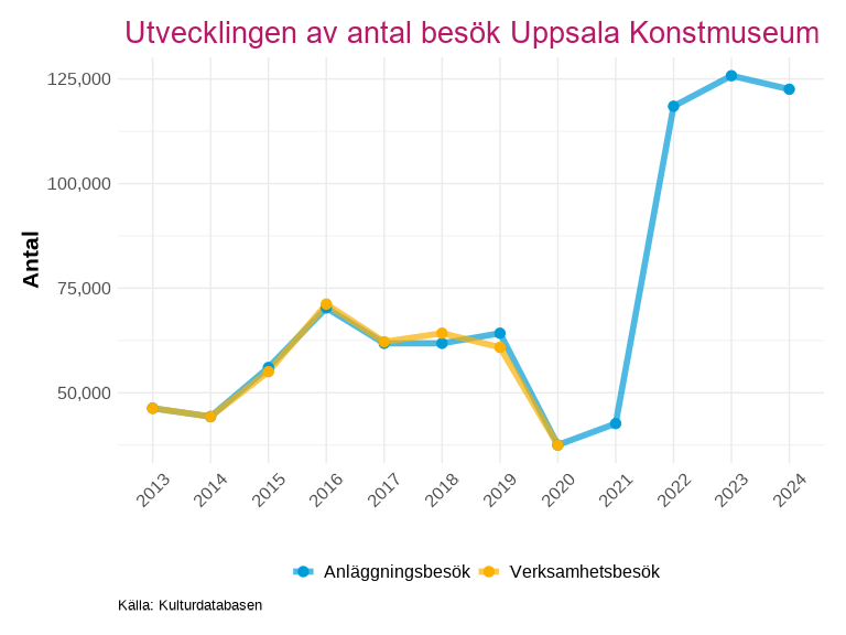 I detta kapitel redovisas statistik för Uppsala län baserat på uppgifter från kulturdatabasen. Det bör noteras att datainsamlingen inte är fullständig för alla verksamheter och år – ju längre tillbaka i tiden som studeras, desto fler verksamheter saknar data. Verksamheter som saknar uppgifter för de två senaste insamlade åren har uteslutits ur analyserna, men ingår i länstotalen för de år då de var verksamma. Resultaten bör därför tolkas med detta i åtanke, särskilt vid jämförelser över längre tidsperioder.