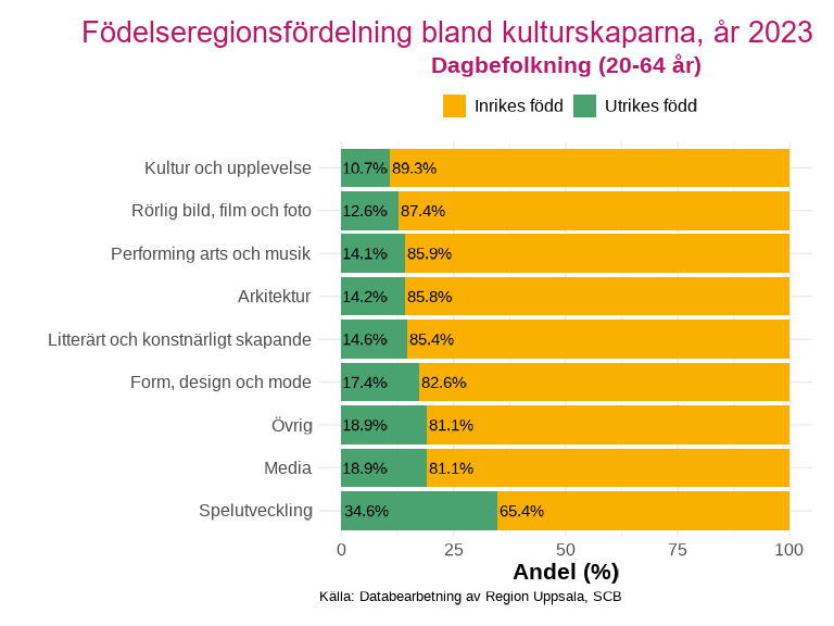 I alla ämnesområden utom spelutveckling så är andelen inrikesfödda kulturskapare över 80 %, men för spelutveckling som är andelen 65,4 %. Den ämneskategorin med den minsta andelen utrikesfödda kulturskapare i länet är kultur och upplevelse.