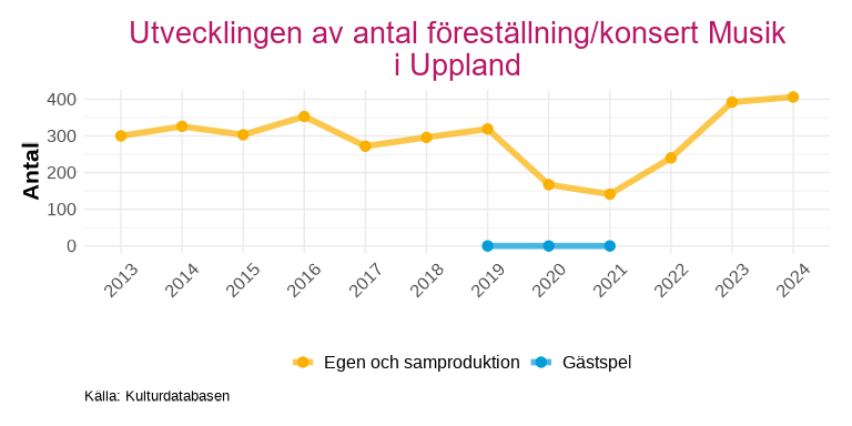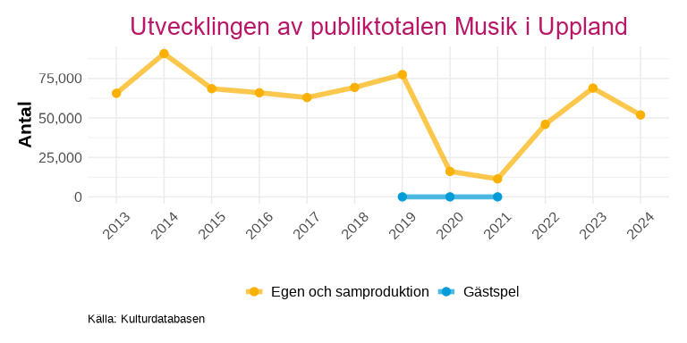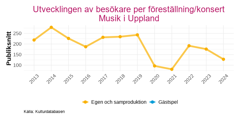 Musik i Uppland visar en annan bild: antalet föreställningar har efter pandemin återhämtat sig och är nu högre än tidigare, men den totala publiken har inte följt med i samma utsträckning. Det innebär att publiken per föreställning har minskat över tid, en trend som är synlig redan före pandemiåren.