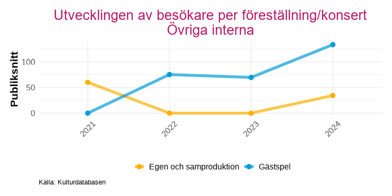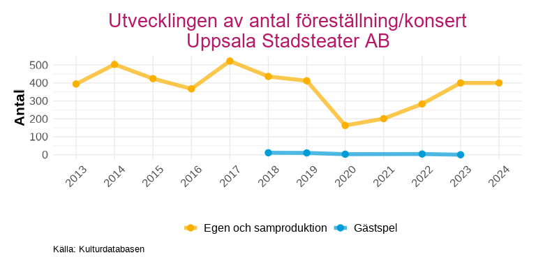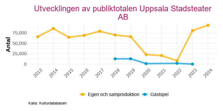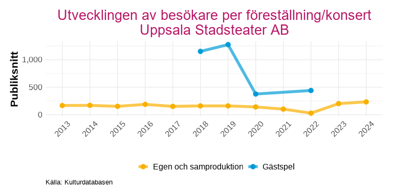 Uppsala Stadsteater uppvisar ett genomgående högre publiksnitt för gästspel än för egna produktioner och samproduktioner. Efter pandemin har publiksnittet för teaterns egna produktioner ändå förbättrats och ligger nu på en högre nivå än åren dessförinnan, trots att antalet föreställningar är i stort sett oförändrat.