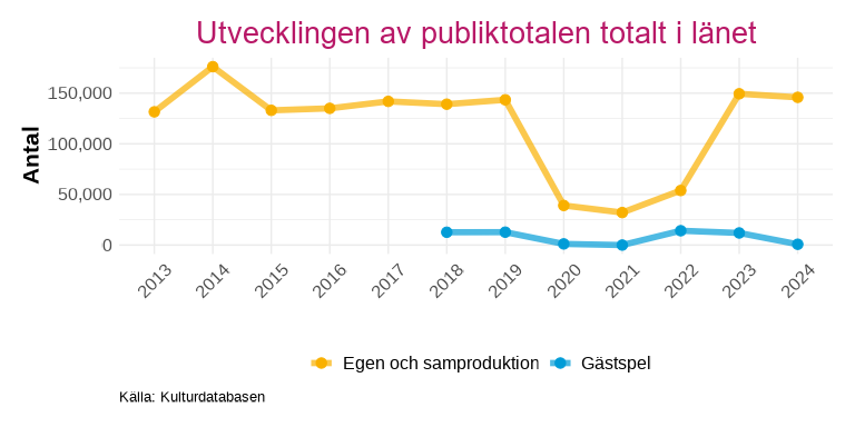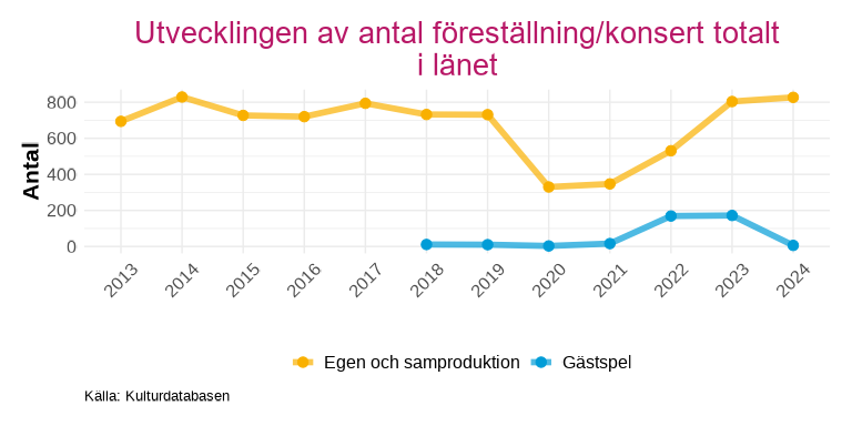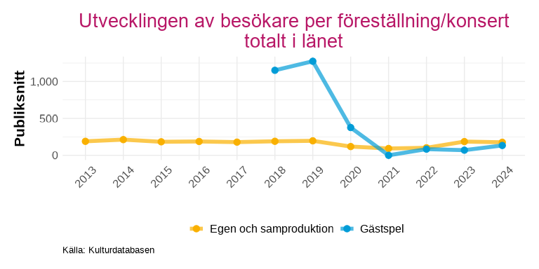 Avsnittet redovisar utvecklingen av antalet föreställningar och konserter samt publik för länets scenkonst, uppdelat på egna produktioner och samproduktioner respektive gästspel. Publiksnittet, det vill säga antal åskådare per föreställning, används som ett mått på hur väl belagda föreställningarna är.
