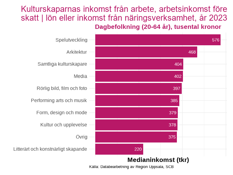 Medianinkomsten för länets kulturskapare är som högst inom spelutveckling på 576 000 kr, följt av arkitektur på 468 000, lägst medianinkomst är inom litterärt och konstnärligt skapande på 220 000 kr. Medianinkomsten för resterande ämnen är mellan 375 000 och 404 00 kr.