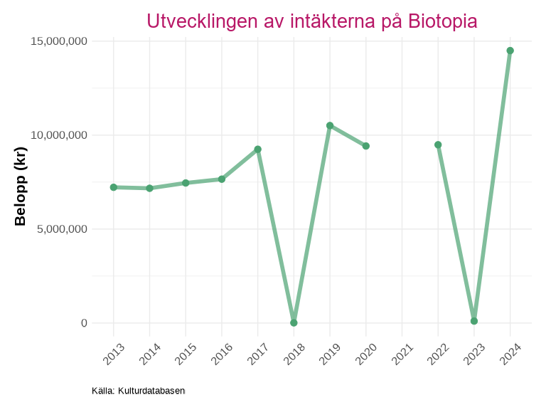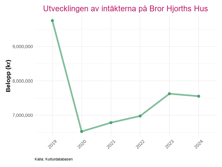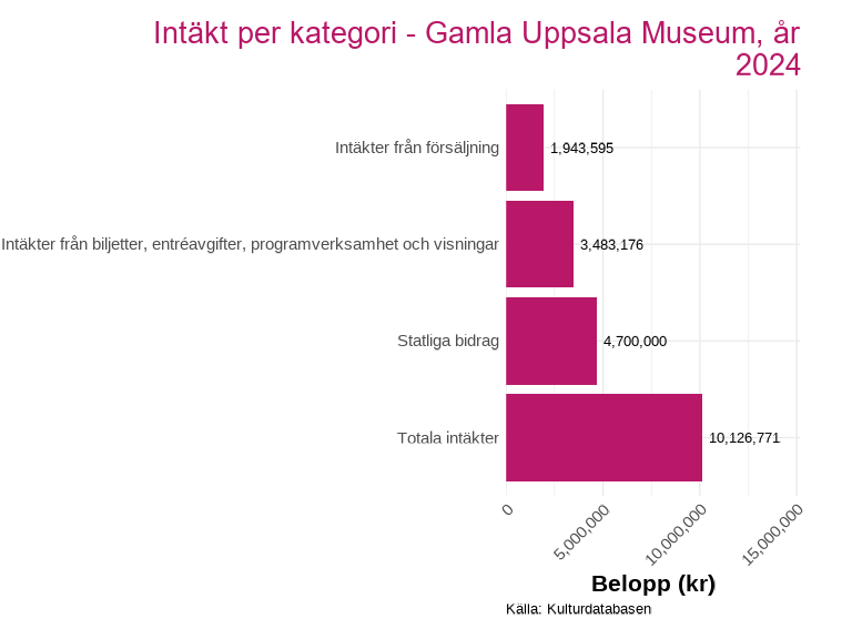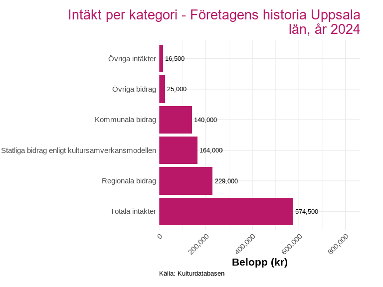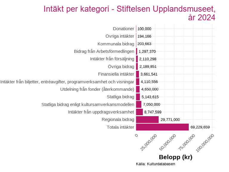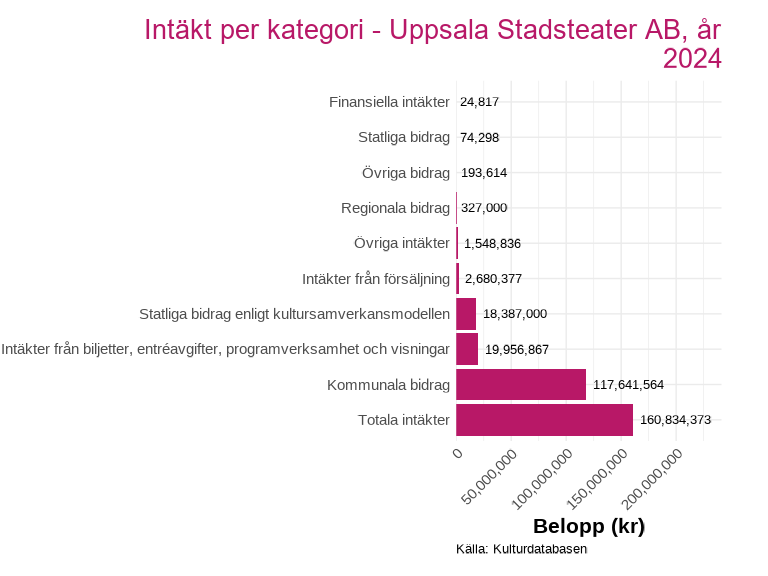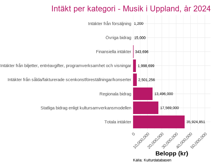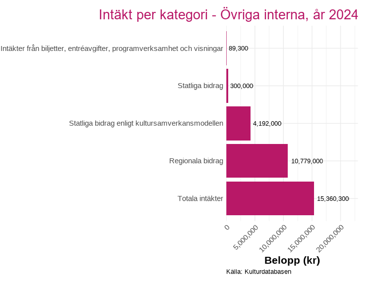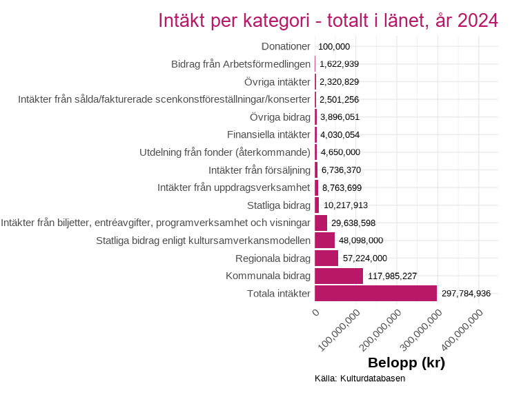 Intäktsdata på detaljerad nivå finns för ett urval av länets kulturverksamheter och presenteras för det senaste tillgängliga året. Uppdelningen visar hur intäkterna fördelar sig mellan olika källor, exempelvis biljettintäkter, kommunala bidrag, regionala bidrag och statliga bidrag inom kultursamverkansmodellen.