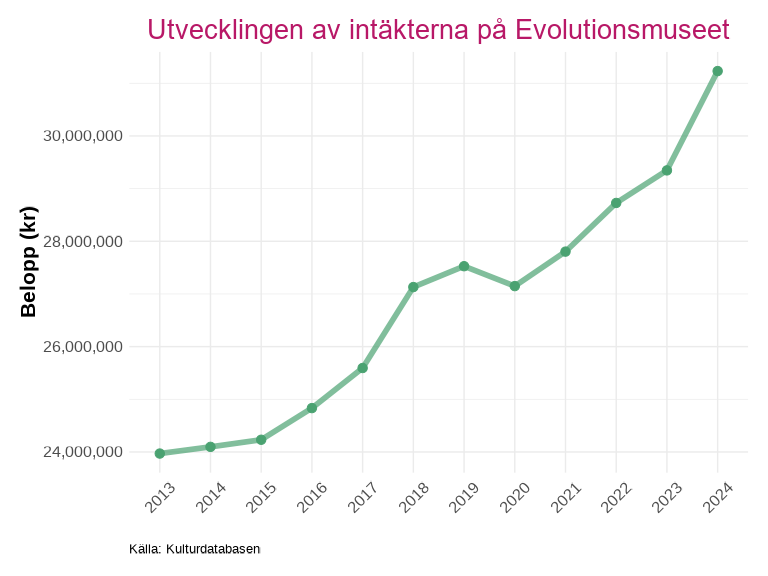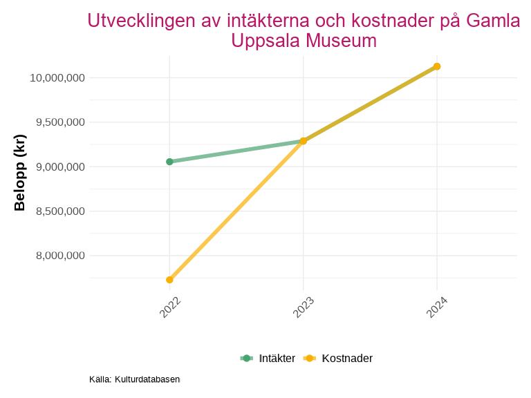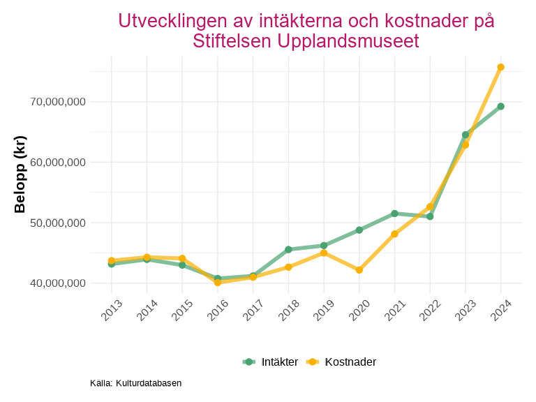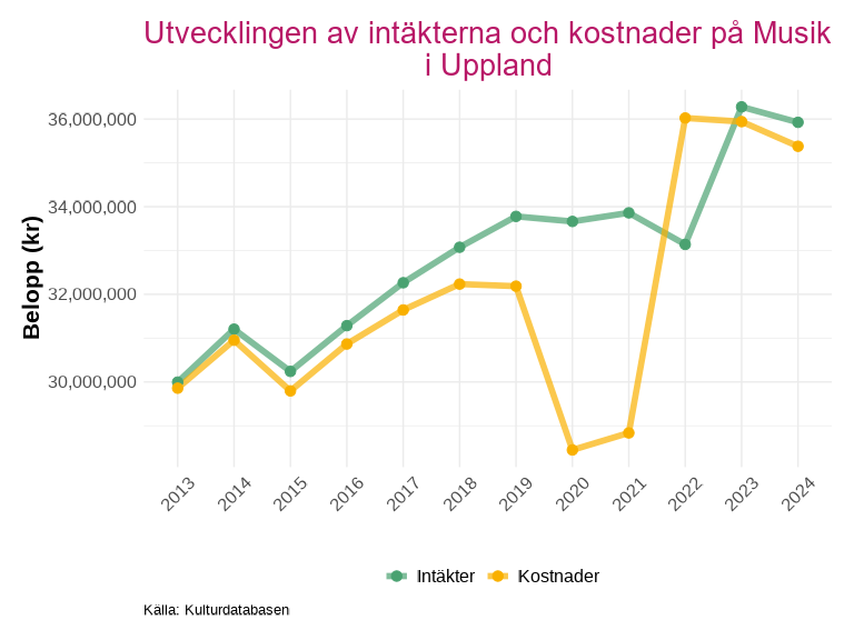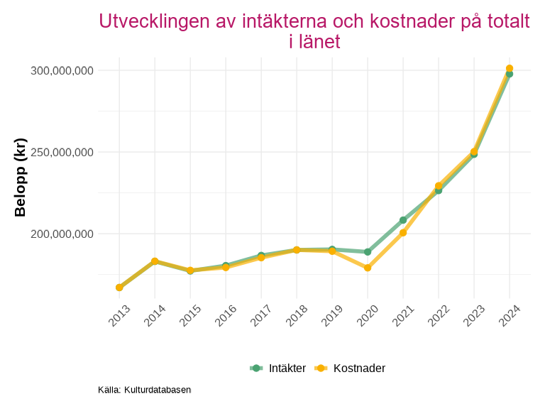 Sedan 2020 har de sammanlagda intäkterna och kostnaderna för länets kulturverksamheter ökat med över 100 miljoner kronor. Intäkter och kostnader följer varandra nära under hela den redovisade perioden, vilket tyder på en stabil ekonomisk balans i sektorn som helhet.