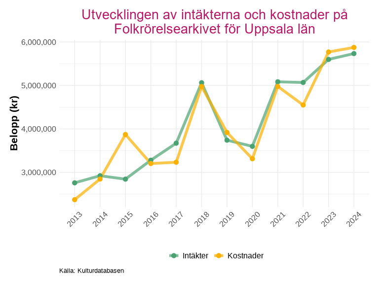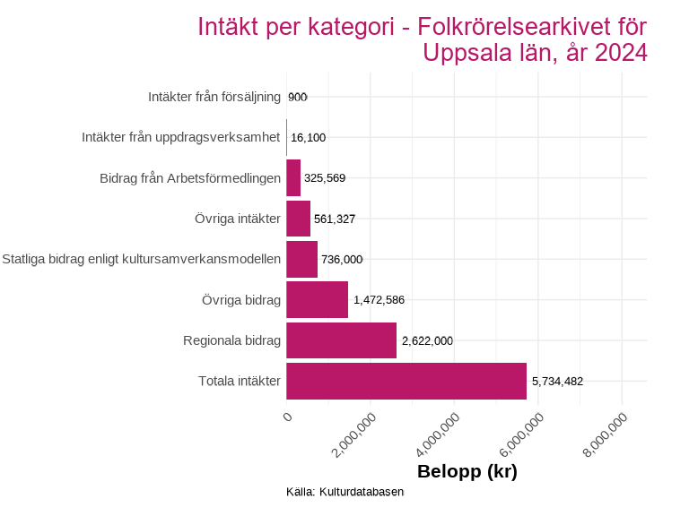 Folkrörelsearkivet för Uppsala län avviker från övriga verksamheter: här utgör övriga bidrag, det vill säga bidrag som varken är kommunala, regionala eller statliga inom kultursamverkansmodellen, en av de största intäktskällorna.