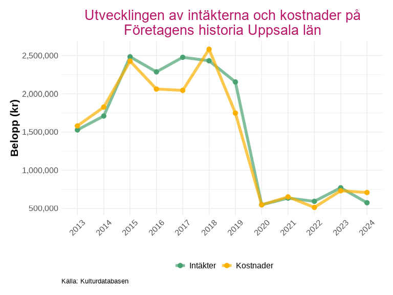 Bror Hjorts Hus och Företagens historia i Uppsala län sticker ut negativt: båda verksamheterna redovisar kraftiga intäktsfall mellan 2019 och 2020, och har ännu inte återhämtat sig till tidigare nivåer. Övriga verksamheter visar en ökande trend för både intäkter och kostnader.