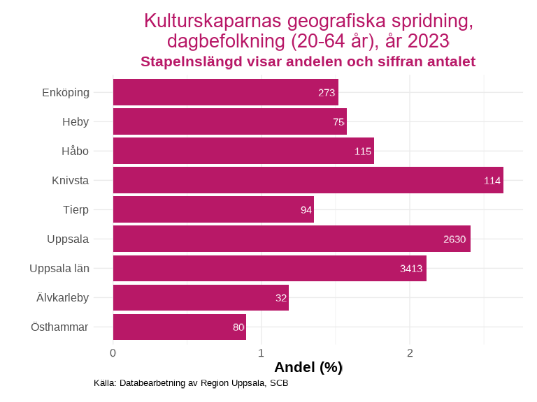 Den kommunen i länet med störst andel kulturskapare av totala dagbefolkningen i kommunen är Knivsta följt av Uppsala kommun. Lägst andel kulturskapare finns i Östhammar på under 1 procent. Den kommunen med det lägsta antalet är Älvkarleby på 32 individer i åldern 20 till 64 år och det totala antalet kulturskapare i länet är 3413.