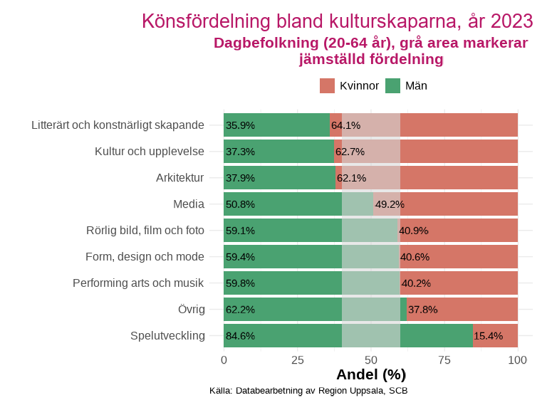 Fyra av ämnesområdena infaller i en jämställd könsfördelning på mellan 40 - 60 %. Den kategori som har den skevaste könsfördelningen är spelutveckling där 84,6 % av alla kulturskapare i länet är män.