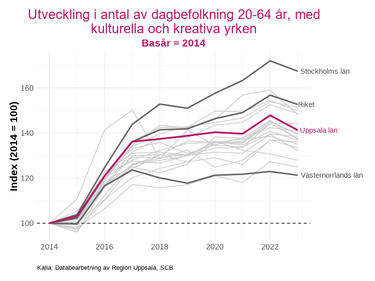 Sett från 2014 så har utvecklingen av antalet kulturskapare ökat i Uppsala län, utvecklingen ligger under genomsnittet i riket, men bättre än de flesta andra länen. Den största utvecklingen skedde fram till 2017 och det största antalet var år 2022, liknande trender syns i nästan alla andra län i Sverige.