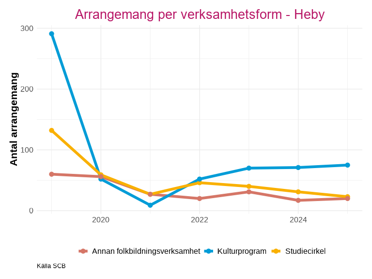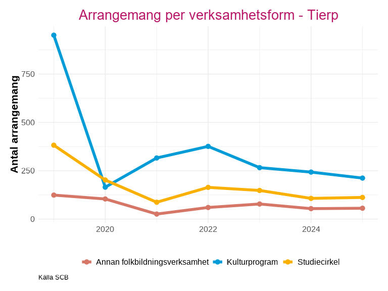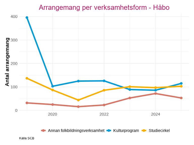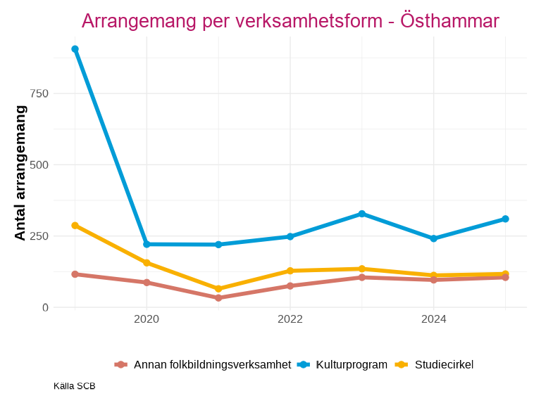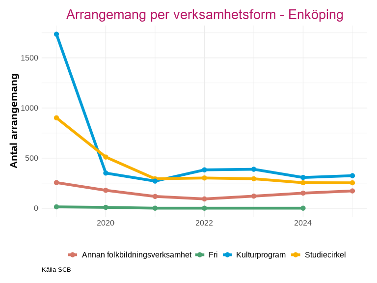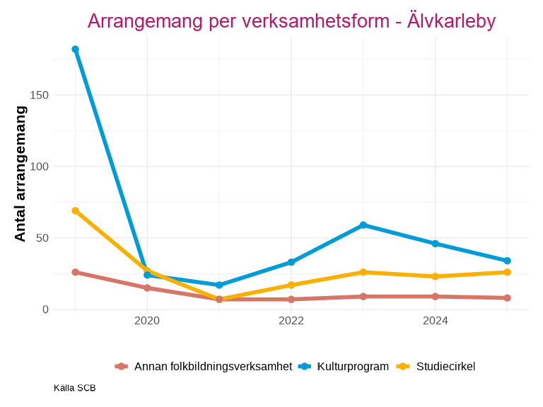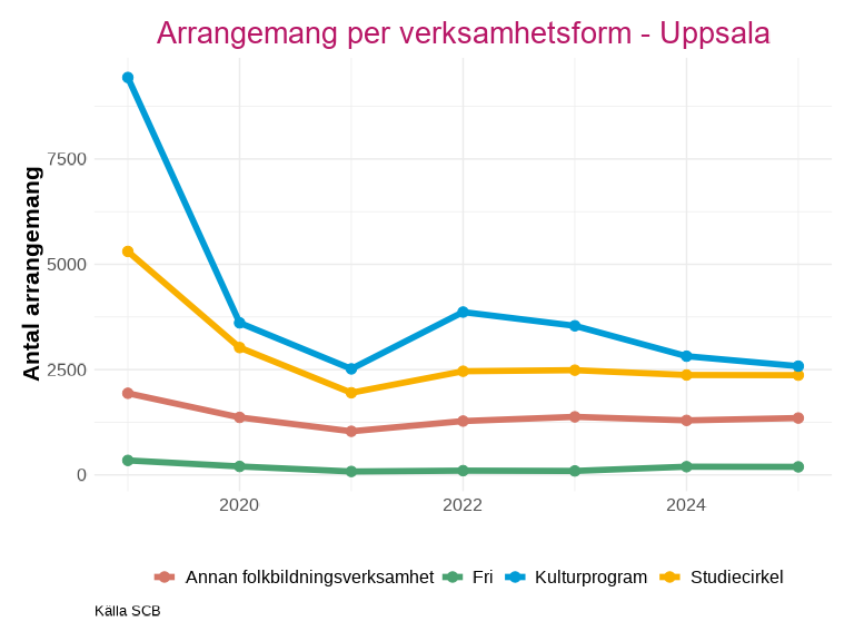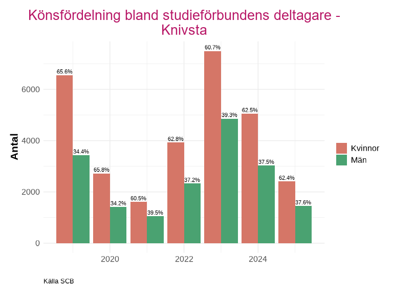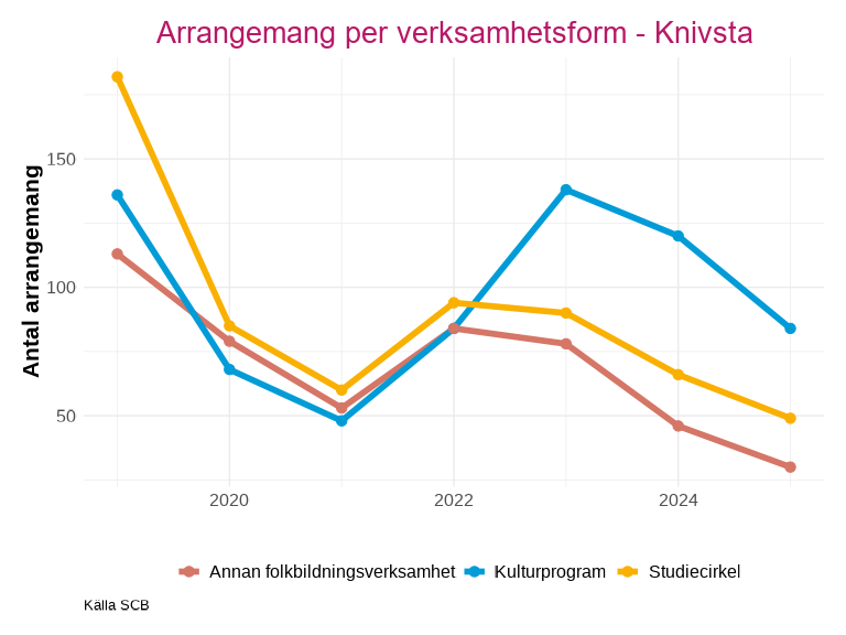 Antalet deltagare inom studieförbundens arrangemang har också sjunkit kraftigt utan att återhämta sig efter pandemin. Knivsta är den enda kommunen som har liknande nivåer eller ett högre deltagarantal efter minskningen 2020.