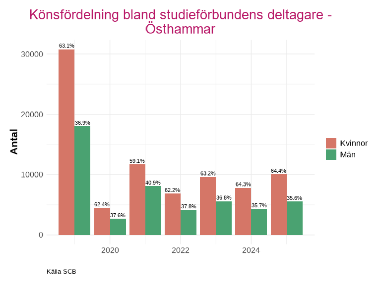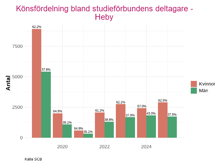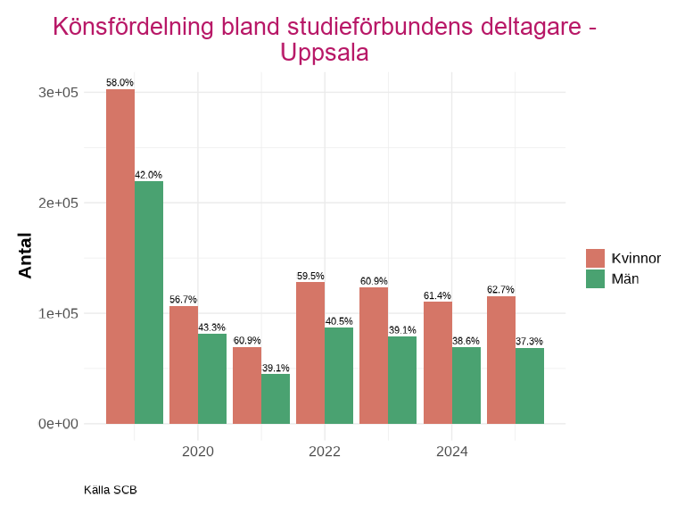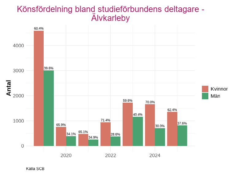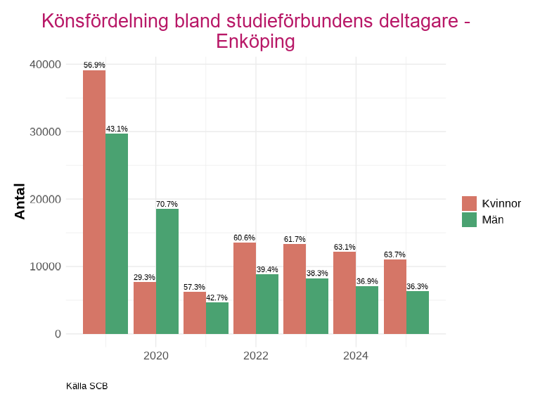 En större del av deltagarna är kvinnor för samtliga kommuner och år, utom år 2020 i Enköping. Där deltagarantalet för män inte ser ut att ha påverkats lika kraftigt av pandemin och stod för 70,7% av deltagarna.
