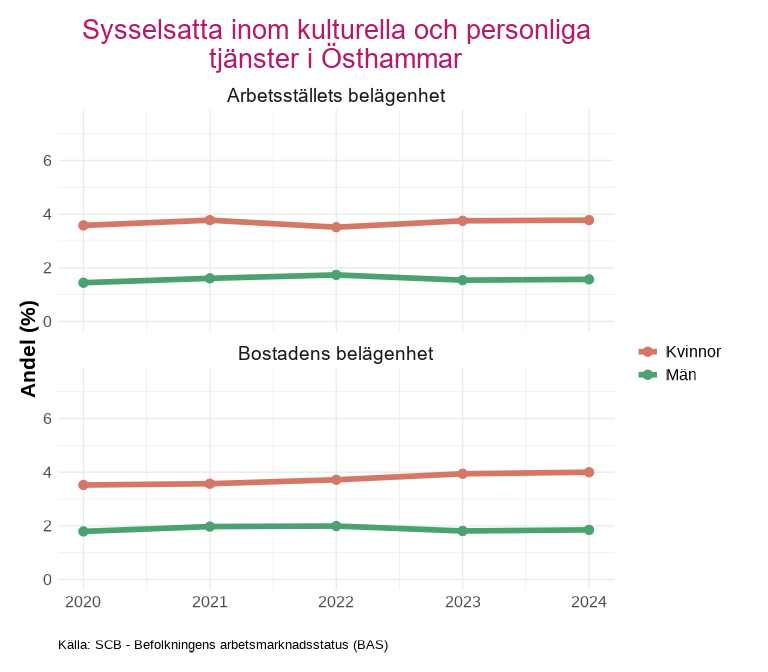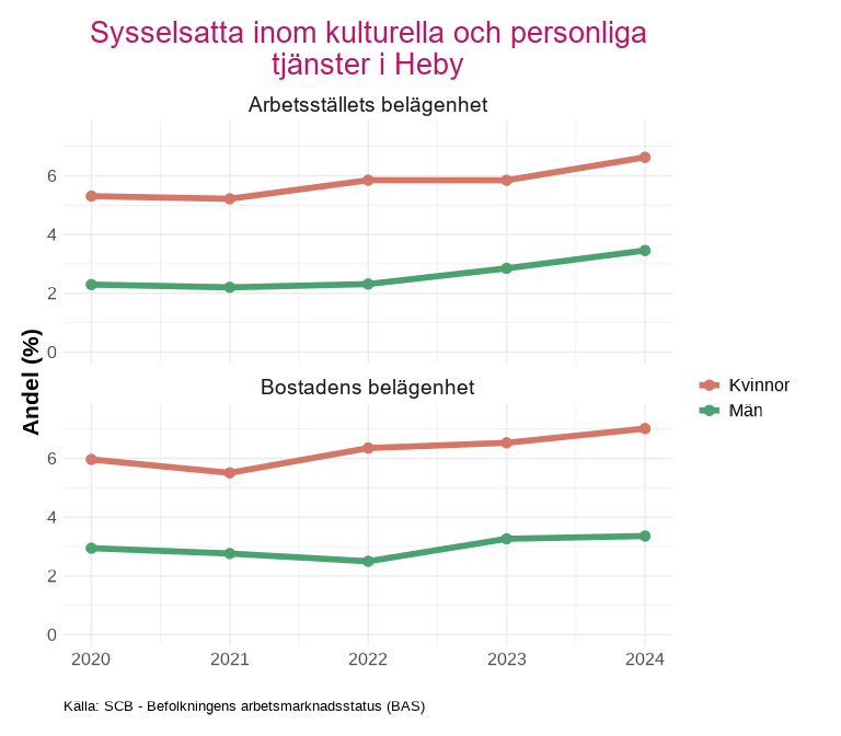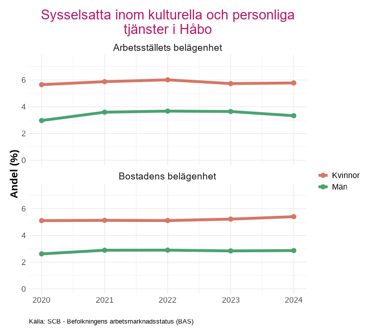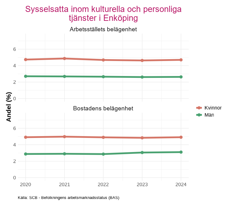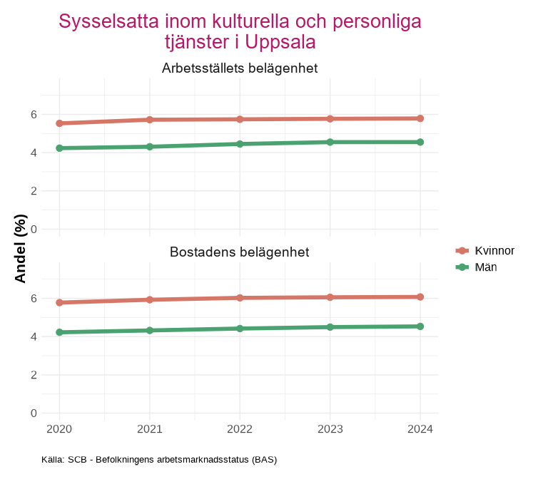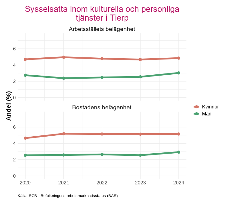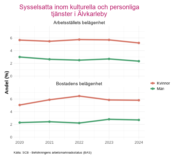 Avsnittet visar andelen sysselsatta efter indikatorn som tas fram av kolada. Indikatorn beskriver andelen sysselsatta i åldern 15-74 år inom kulturella och personliga tjänster m.m. (SNI-kod R, S, T och U). Andelen beräknas som antalet sysselsatta inom dessa näringsgrenar i relation till det totala antalet sysselsatta.