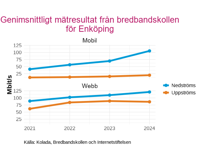 Genomsnittliga mätresultat från bredbandskollen i  Enköping , uppdelat på Mobilt och webb för 2021 till 2024