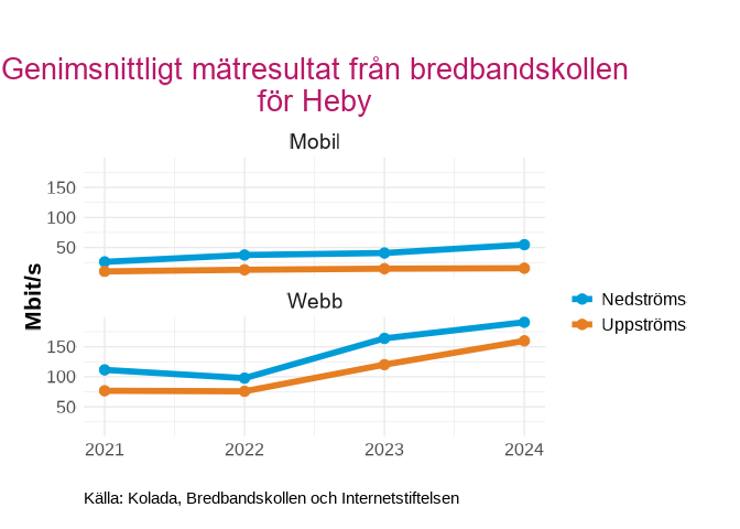 Genomsnittliga mätresultat från bredbandskollen i  Heby , uppdelat på Mobilt och webb för 2021 till 2024