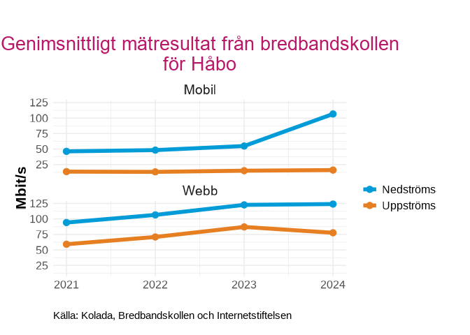Genomsnittliga mätresultat från bredbandskollen i  Håbo , uppdelat på Mobilt och webb för 2021 till 2024