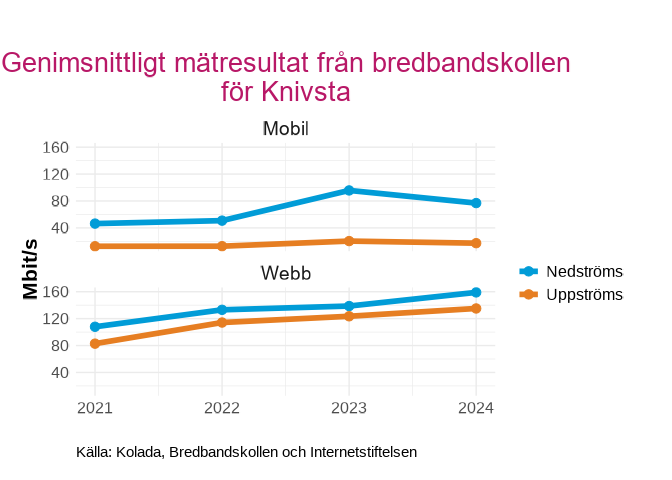 Genomsnittliga mätresultat från bredbandskollen i  Knivsta , uppdelat på Mobilt och webb för 2021 till 2024