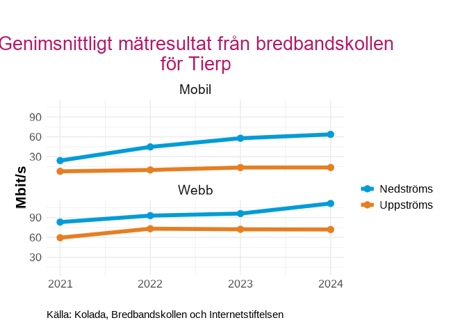 Genomsnittliga mätresultat från bredbandskollen i  Tierp , uppdelat på Mobilt och webb för 2021 till 2024