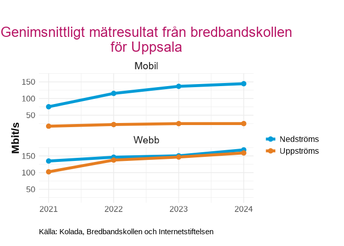 Genomsnittliga mätresultat från bredbandskollen i  Uppsala , uppdelat på Mobilt och webb för 2021 till 2024