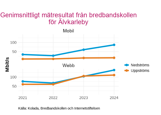 Genomsnittliga mätresultat från bredbandskollen i  Älvkarleby , uppdelat på Mobilt och webb för 2021 till 2024