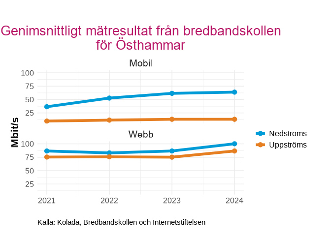 Genomsnittliga mätresultat från bredbandskollen i  Östhammar , uppdelat på Mobilt och webb för 2021 till 2024