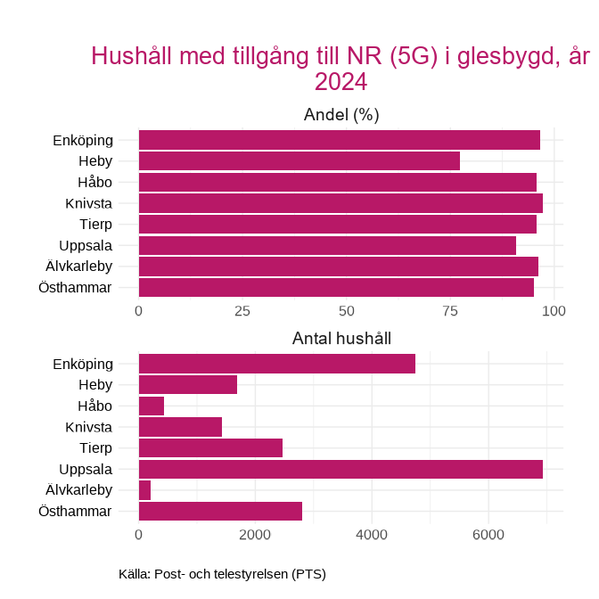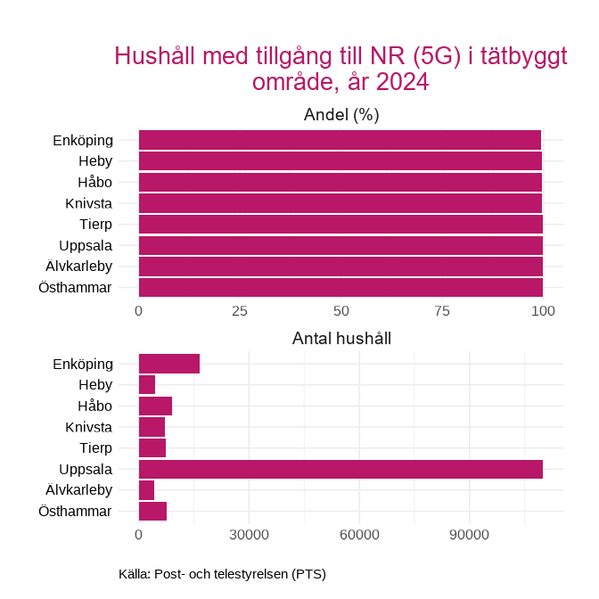 I tätbyggda områden så har nästan alla hushåll tillgång till 5G i länets kommuner, men på glesbygden är det något lägre andelar, där Heby har den lägsta andelen på 77.3 procent och Uppsala kommun har näst lägst andel på 90.9 procent.