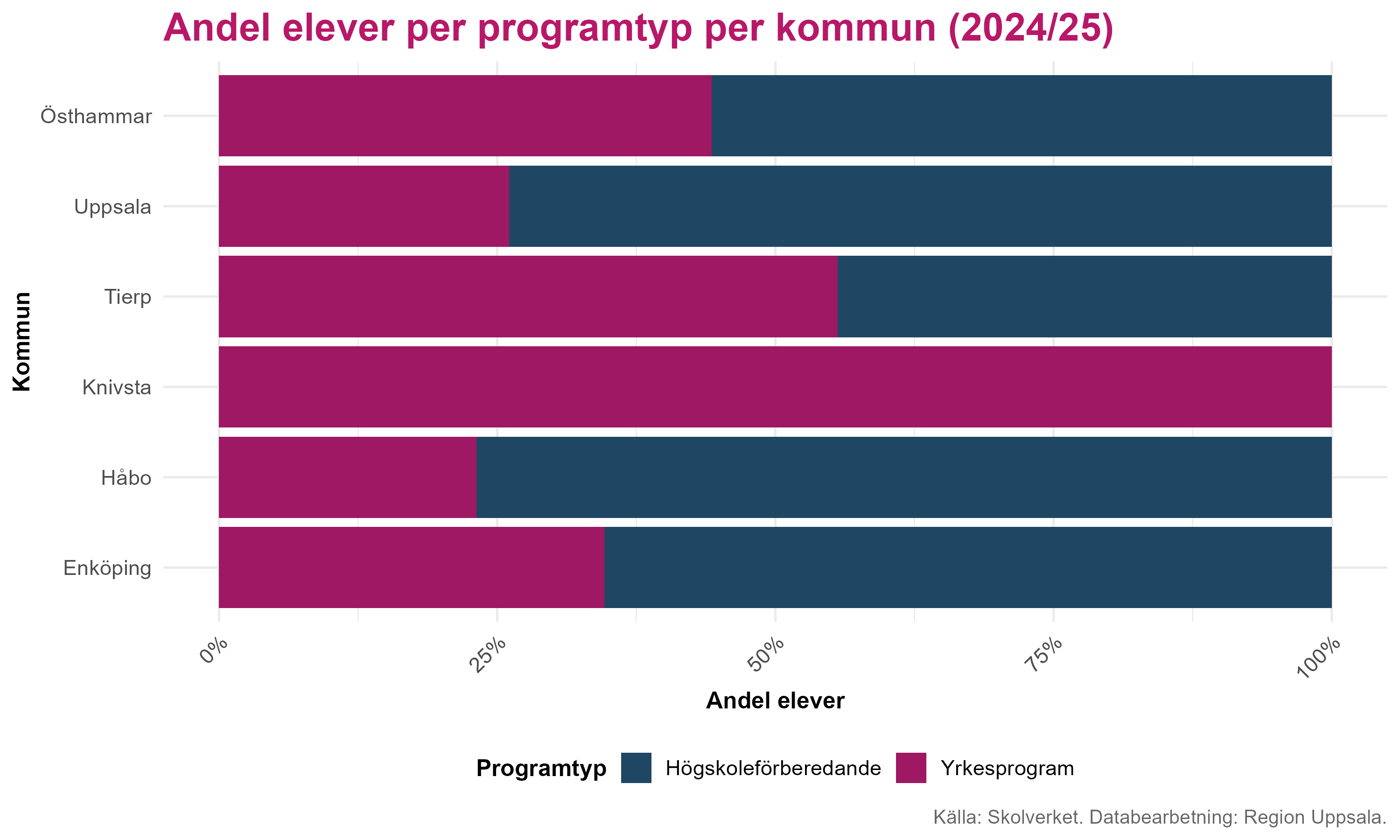 I de flesta kommuner går en större andel elever på högskoleförberedande program, medan Knivsta avviker genom att enbart erbjuda yrkesprogram. Andelen elever på yrkesprogram är relativt hög i Tierp och Östhammar jämfört med övriga kommuner.