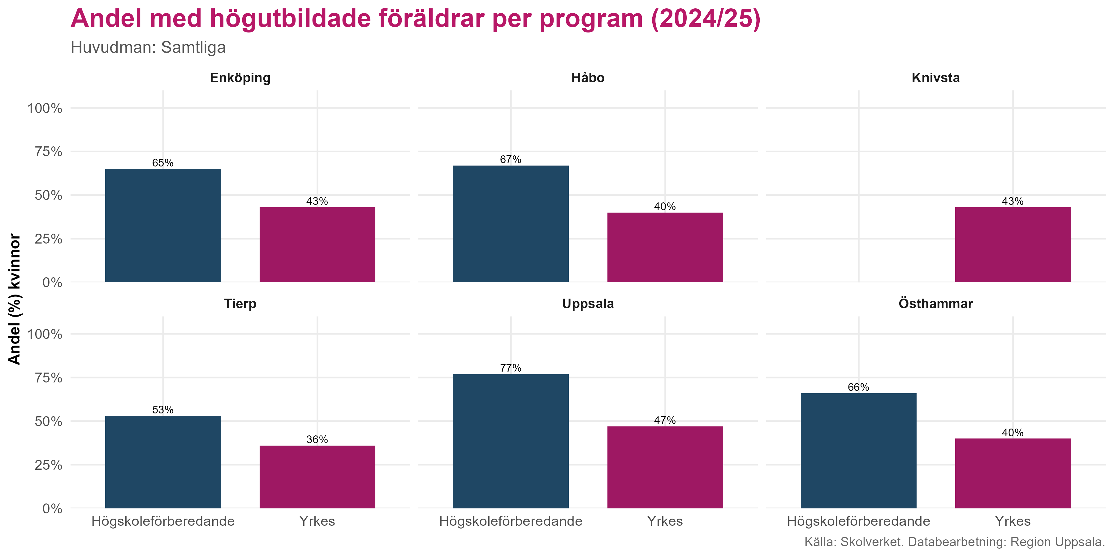 Figur 4 visar andelen gymnasieelever i Uppsala län läsåret 2024/25 med högutbildade föräldrar. I samtliga kommuner är andelen högre på de högskoleförberedande programmen än på yrkesprogrammen. Skillnaderna mellan programtyperna är särskilt stora i Uppsala, Enköping, Håbo och Östhammar, där skillnaden uppgår till omkring 20–30 procentenheter, medan skillnaderna är något mindre i Tierp.