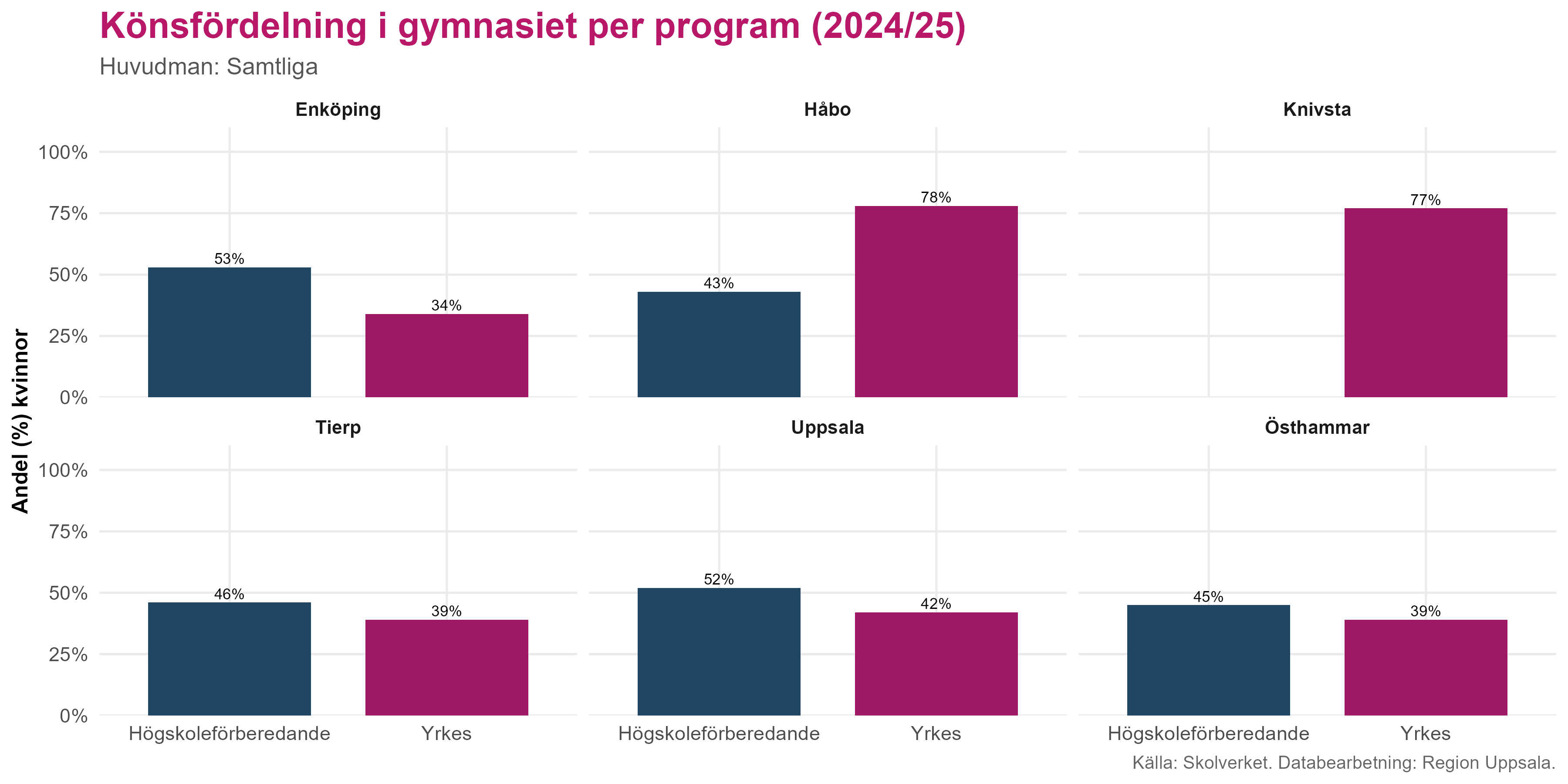 Figur 2 visar könsfördelningen bland gymnasieelever i Uppsala län läsåret 2024/25. I samtliga kommuner är andelen kvinnor högre på de högskoleförberedande programmen än på yrkesprogrammen. Skillnaderna mellan programtyperna är särskilt tydliga i Håbo och Knivsta, medan skillnaderna är mindre i Enköping, Tierp och Östhammar.