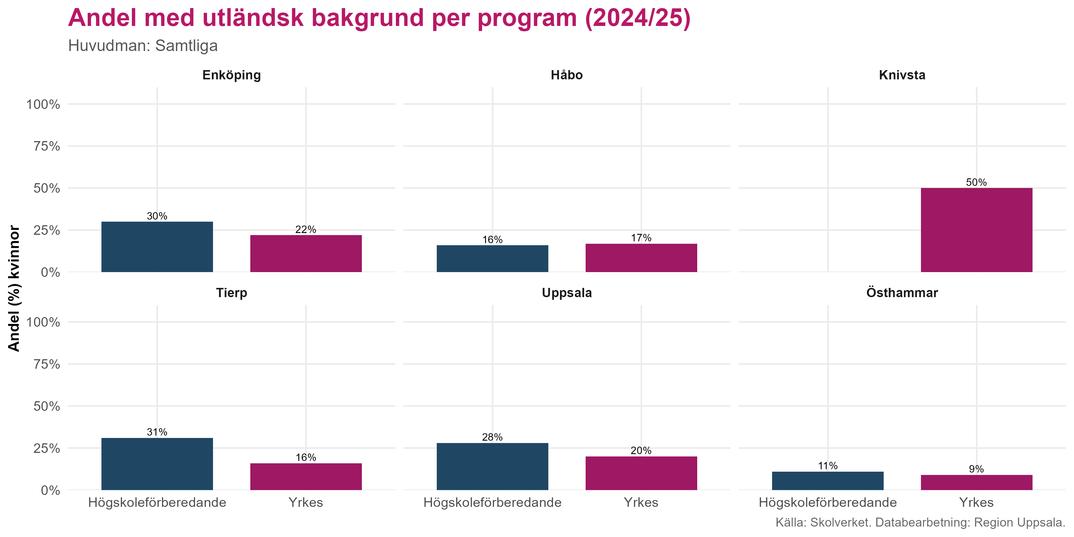 Figur 3 visar andelen gymnasieelever med utländsk bakgrund i Uppsala län läsåret 2024/25. I flera kommuner är andelen högre på de högskoleförberedande programmen än på yrkesprogrammen. I Uppsala, Enköping och Tierp ligger andelen runt 30 procent på de högskoleförberedande programmen och omkring 20 procent på yrkesprogrammen. I Håbo är andelarna ungefär lika mellan programtyperna. De lägsta andelarna återfinns i Östhammar, med cirka 11 procent på de högskoleförberedande programmen och 9 procent på yrkesprogrammen. I Knivsta erbjuds endast yrkesprogram, där andelen elever med utländsk bakgrund uppgår till 50 procent.
