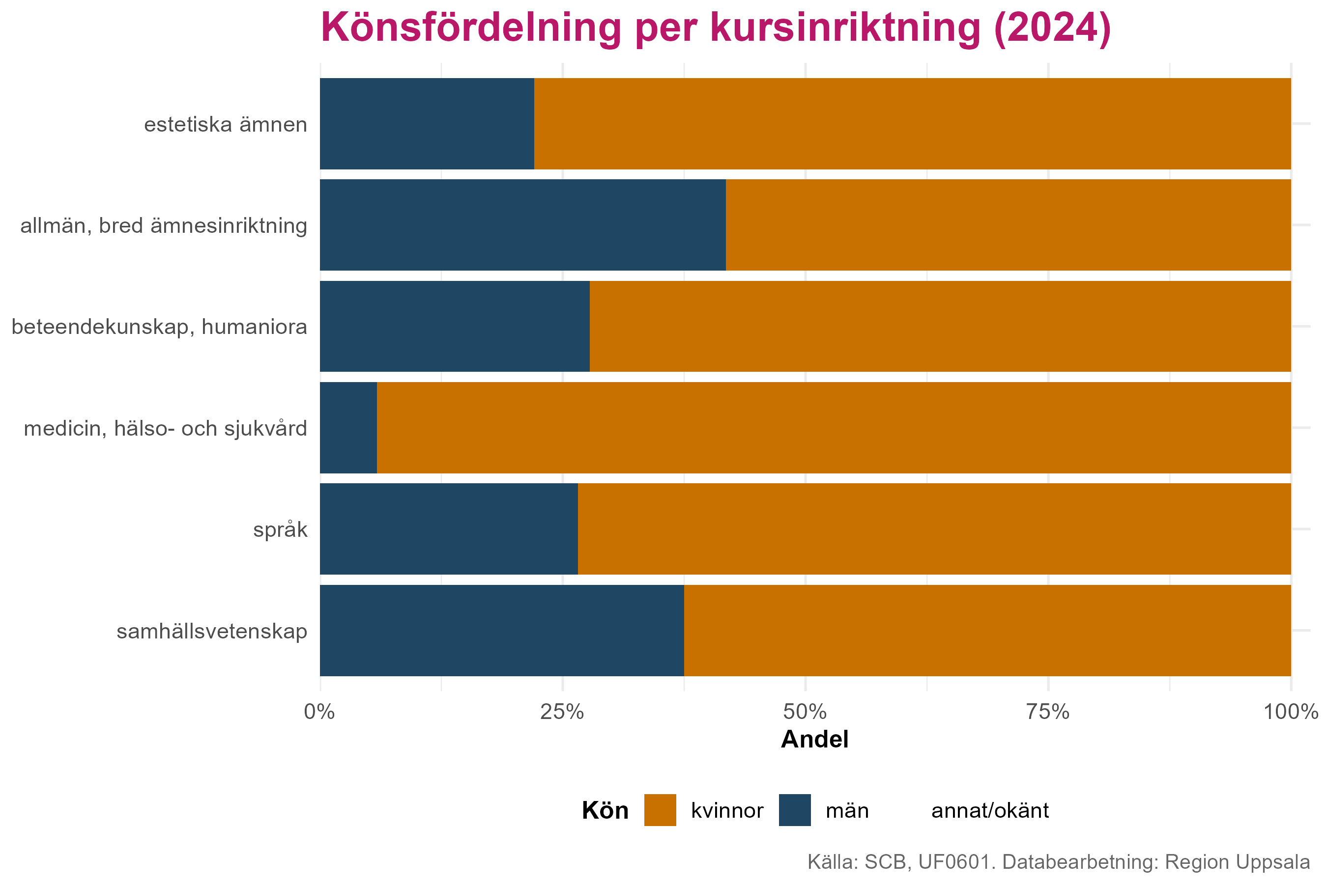Alla kursinriktningar är kvinnodominerade. För allmän, bred ämnesinriktning och samhällsvetenskap är andelen män högst, omkring 40 procent. Inom krusinriktningarna estetiska ämnen, beteendekunskap, humaniora samt språk ligger andelen män endast mellan 20 och 30 procent. Medicin, hälso- och sjukvård är den mest kvinnodominerade inriktningen, där andelen män uppgår till endast 6 procent.