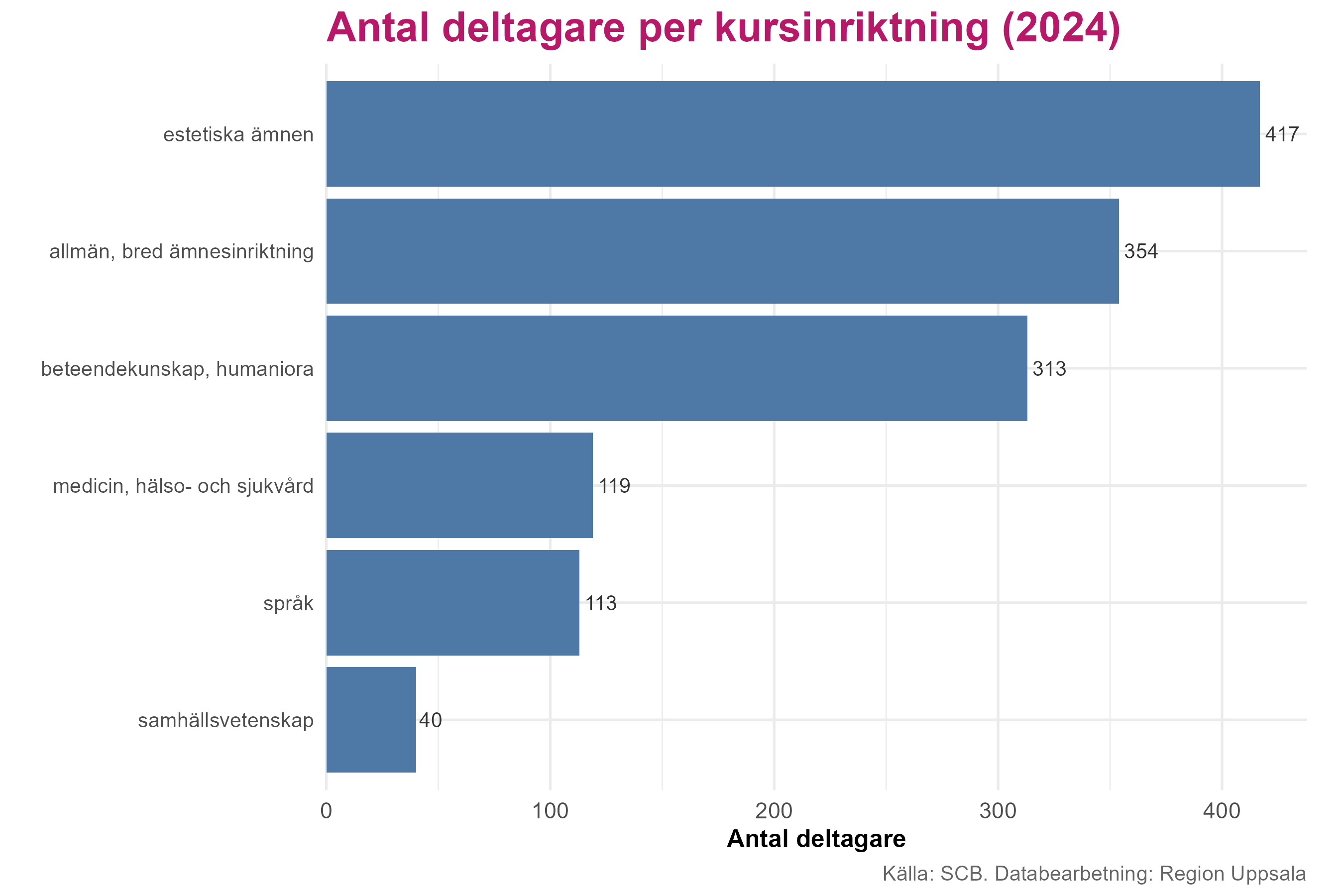 Dessa tre områden utgör tillsammans majoriteten av kursutbudet vid folkhögskola/orna i länet. Inriktningar som medicin, hälso- och sjukvård samt språk har ett mer begränsat deltagande, medan samhällsvetenskap är den minsta inriktningen med endast 40 deltagare.