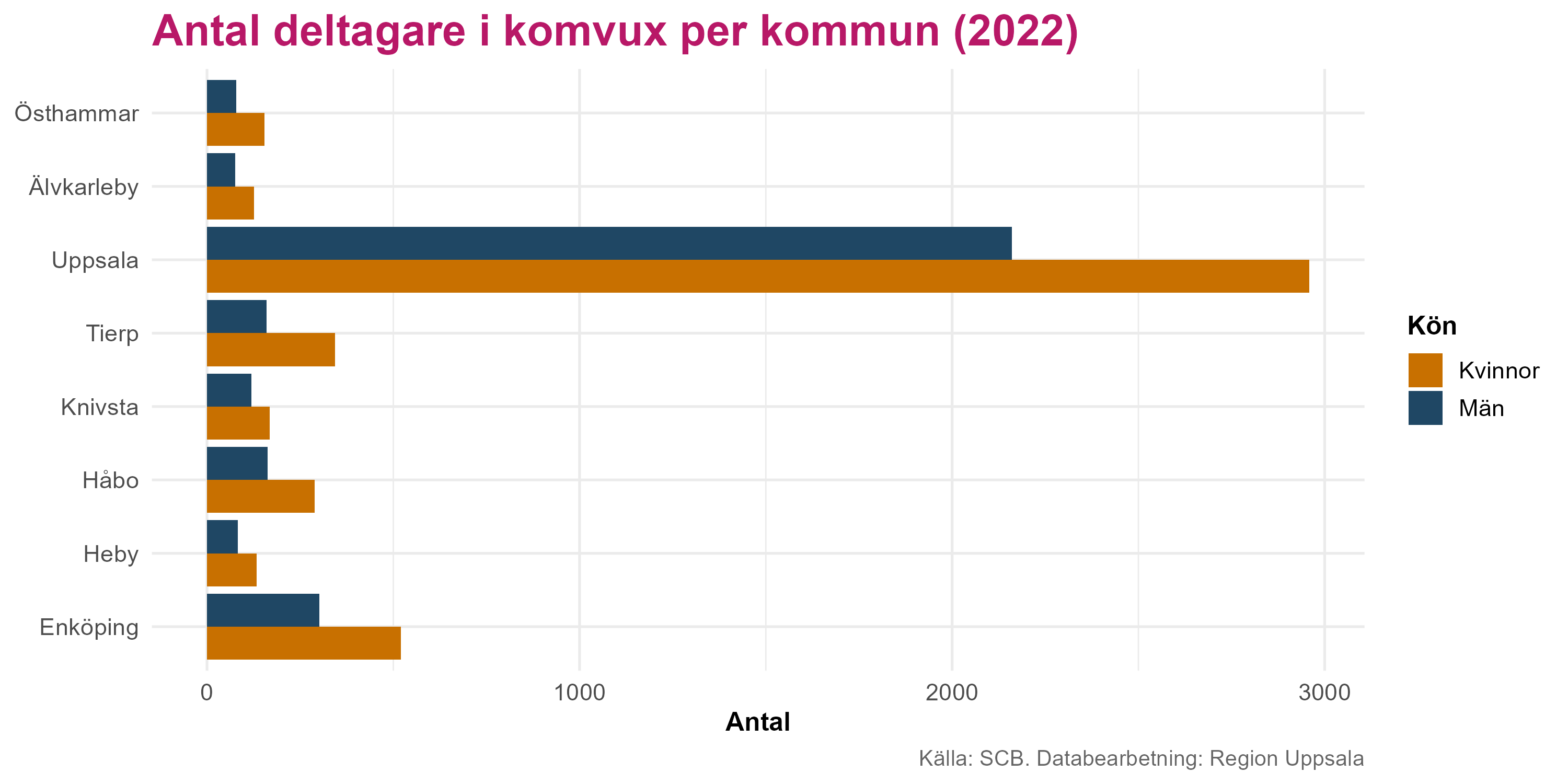 Figur 14 visar antalet deltagare i komvux i Uppsala län år 2022. Antalet deltagare är störst i Uppsala kommun. Det finns en tydlig strukturell könsskillnad, där kvinnor utgör en större andel av deltagarna i samtliga kommuner.