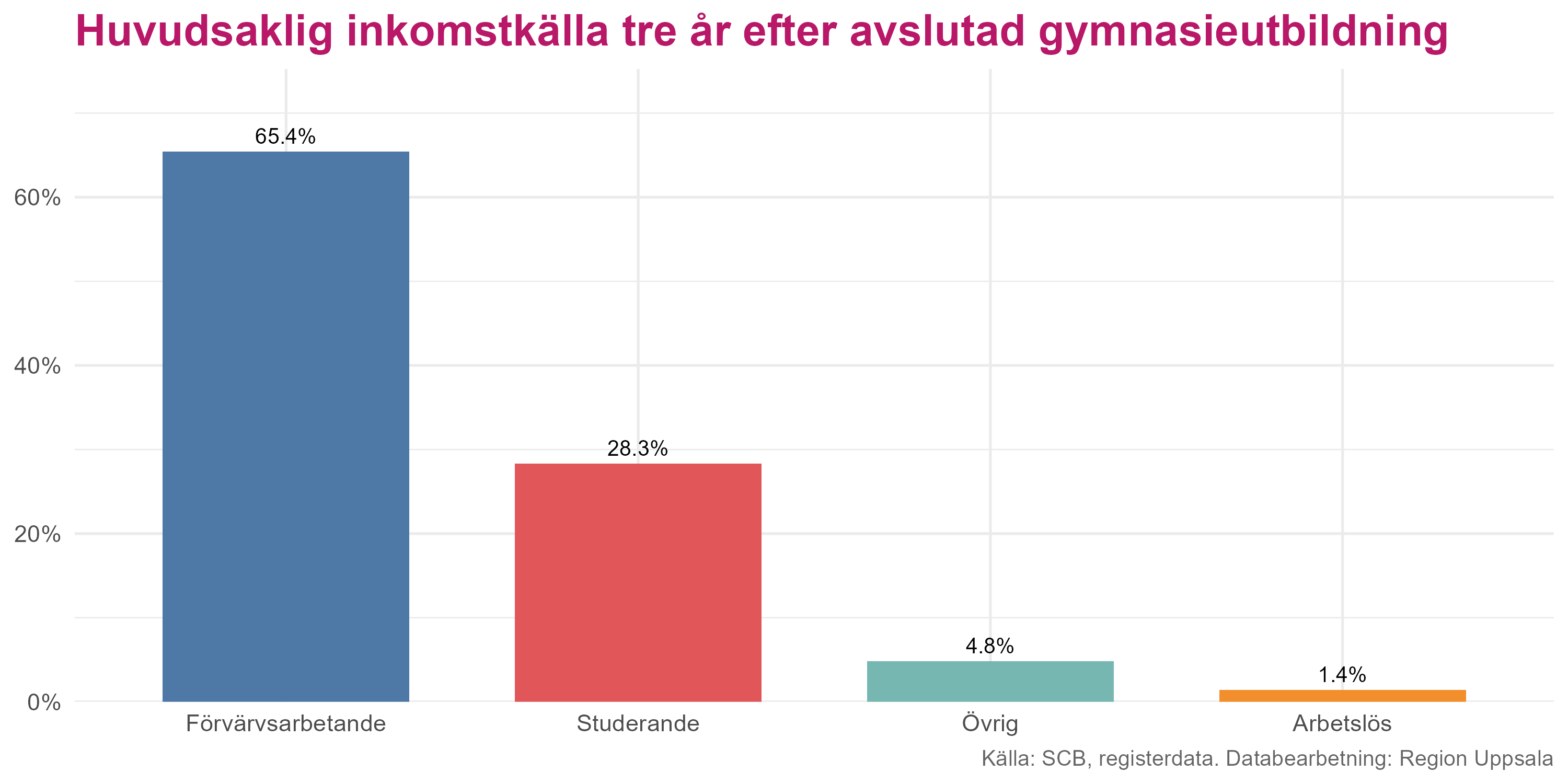 Tre år efter gymnasieexamen är en klar majoritet (65.4 procent) förvärvsarbetande, vilket tyder på god övergång till arbetslivet för denna kohort. Nästan en tredjedel (28.3 procent) är fortfarande inskrivna i utbildning - det kan inkludera både högre studier och annan vidareutbildning — vilket visar att utbildningsvägen fortfarande är ett viktigt spår för många. Observera att den faktiska studerande är högre, eftersom att personer som både studerar och förvärvsarbetar i vår klassificering räknas som förvärvsarbetande. En kort subanalsy av studenterna visas nedan. Andelen som klassificeras som arbetslös är låg (1,4 procent), medan 4,8 procent hamnar i kategorin ”Övrig” (t.ex. sjukskrivning, föräldraledighet eller andra icke-arbetsmarknadsstatusar).