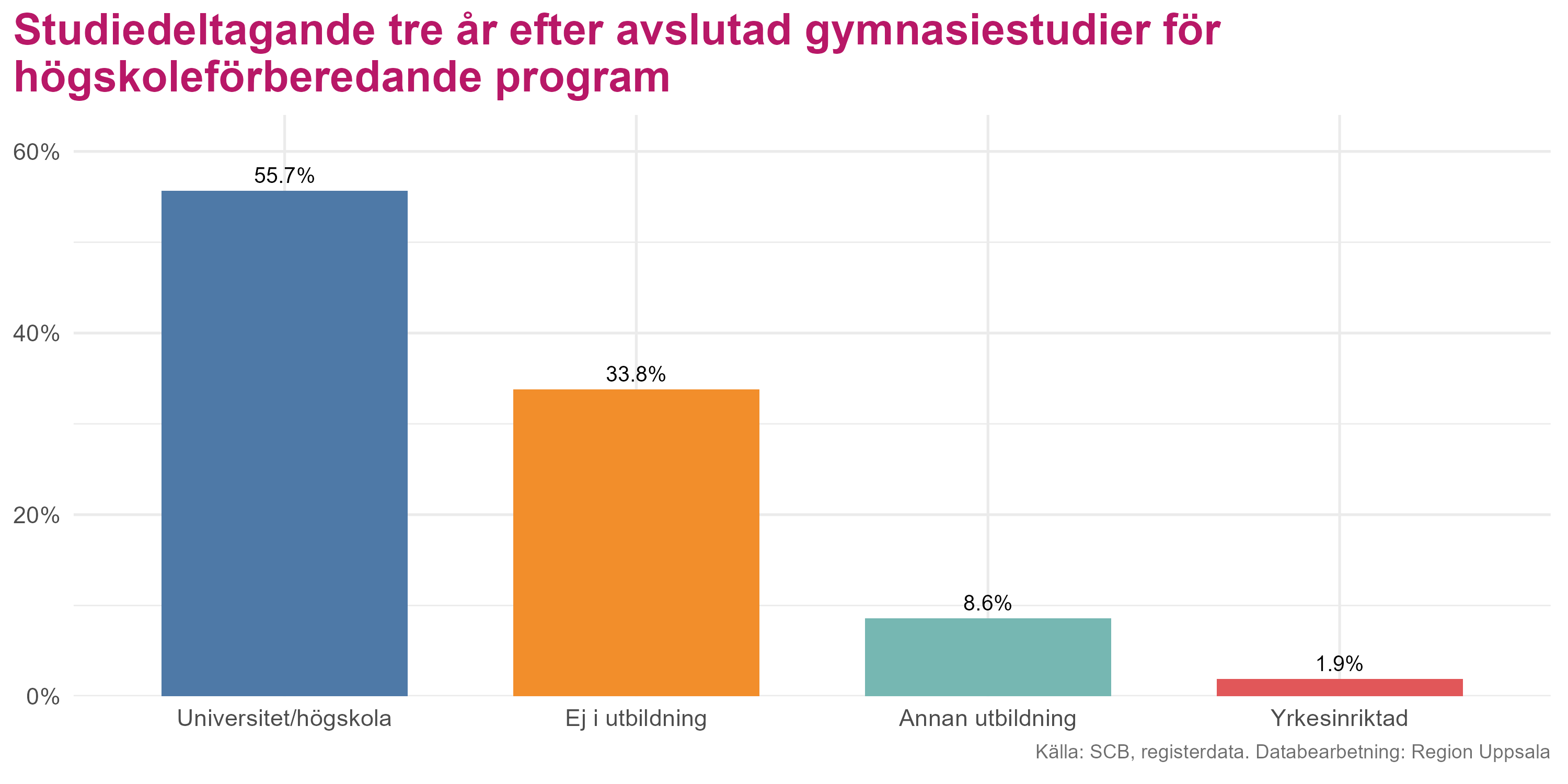 Följande avsnitt analyserar gymnasieelever tre år efter avslutad gymnasieutbildning. Datan omfattar elever som avslutade gymnasiet under åren 2016–2018 och följdes upp under perioden 2019–2021.
