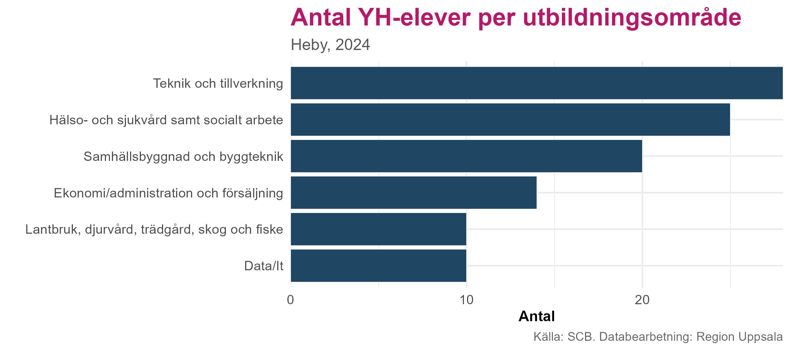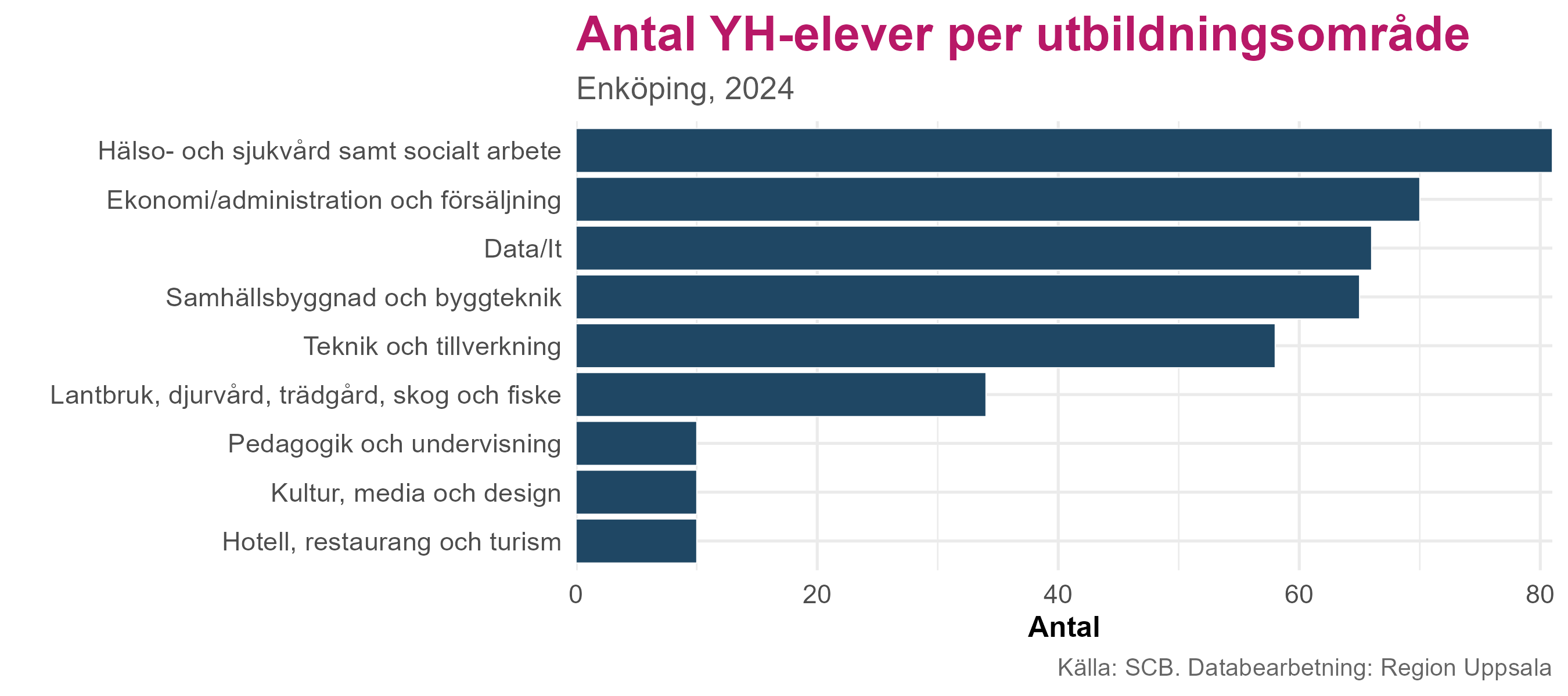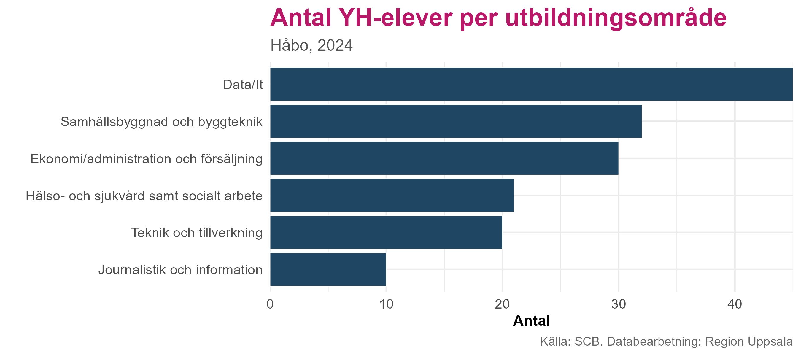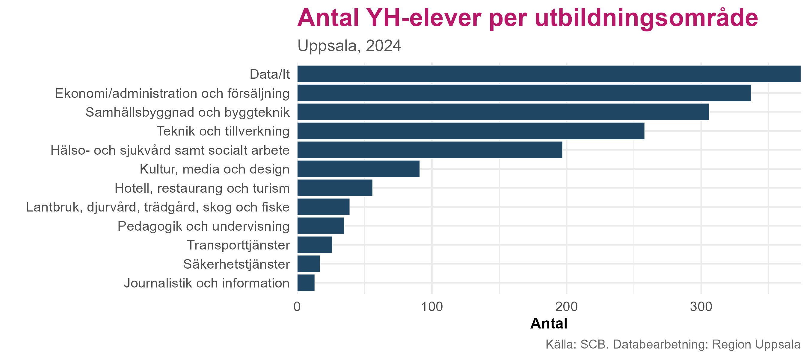 Följande statistik avser YH-elever som är folkbokförda i Uppsala län. Uppgifterna redovisas efter hemkommun, inte efter var utbildningen bedrivs. Utbildningar med färre än 10 elever redovisas inte i statistiken av sekretesskäl. Det innebär att vissa utbildningsområden kan finnas, men inte visas i statistiken.