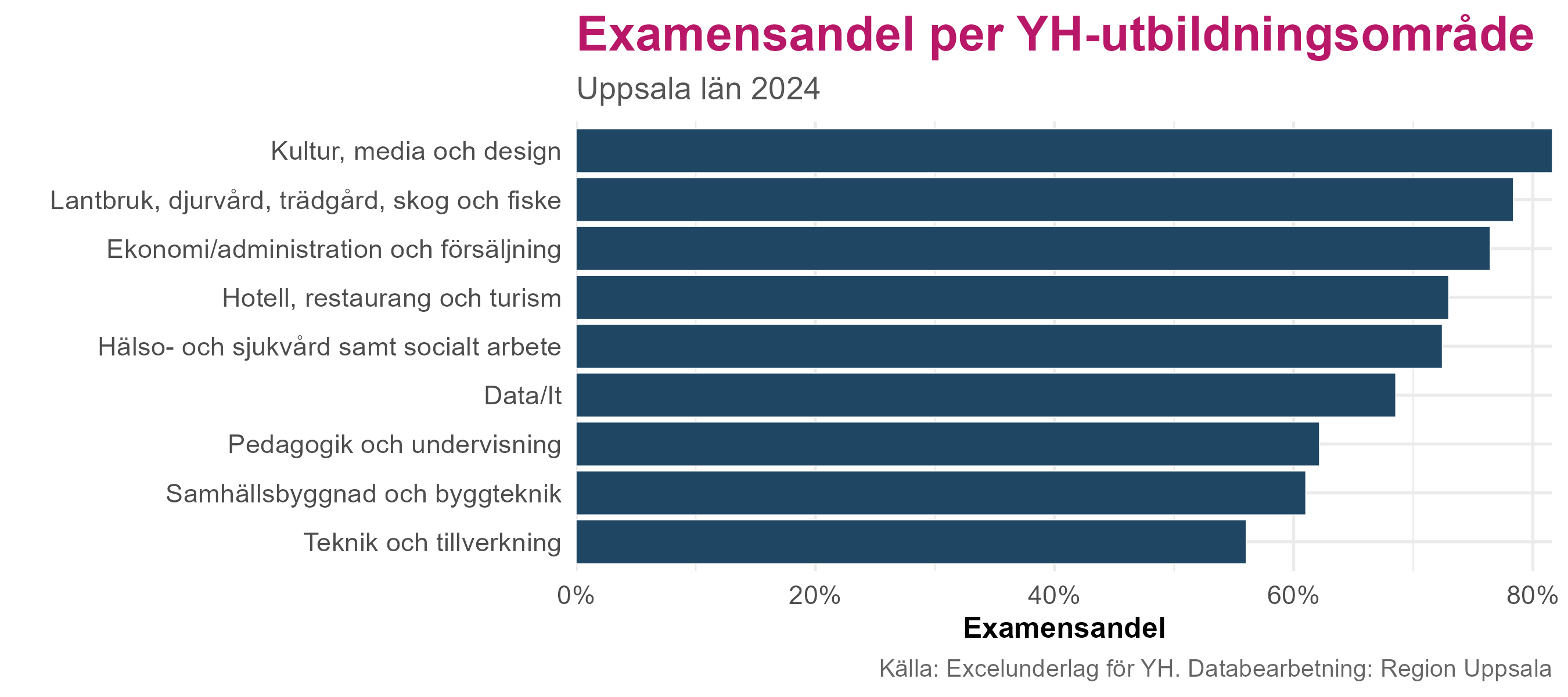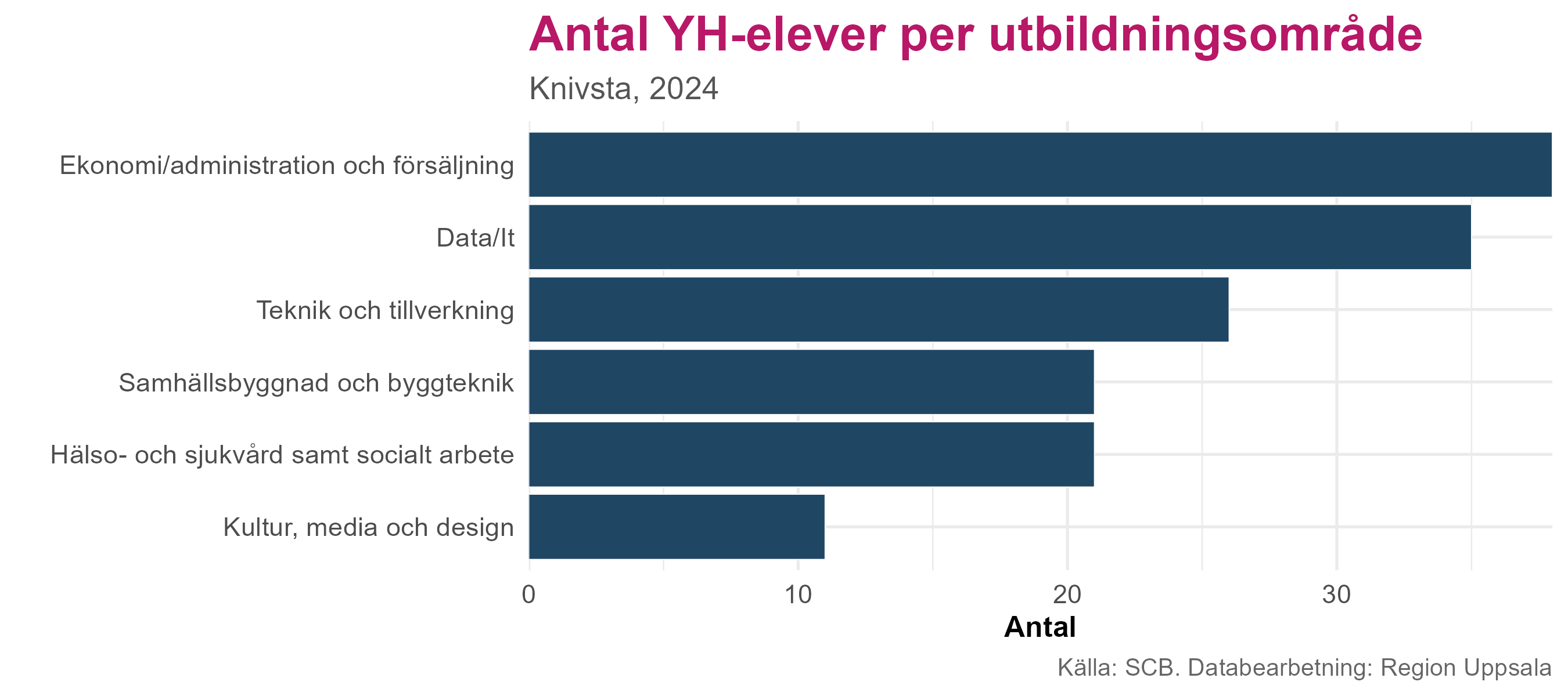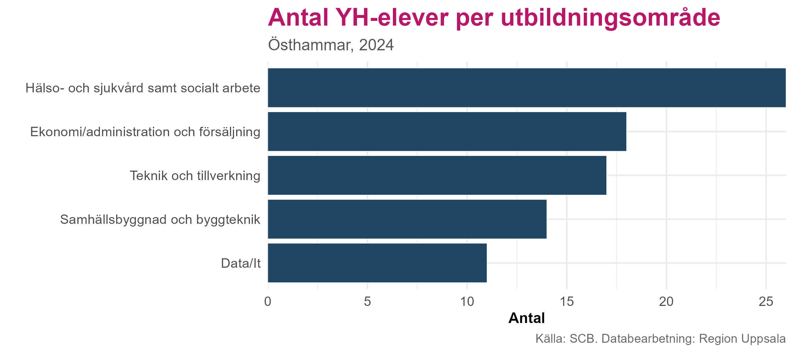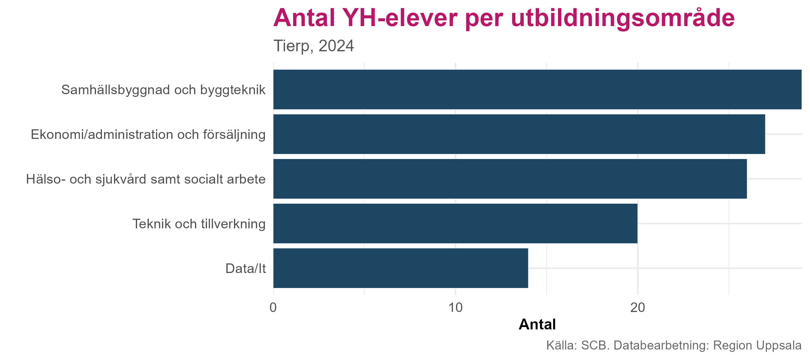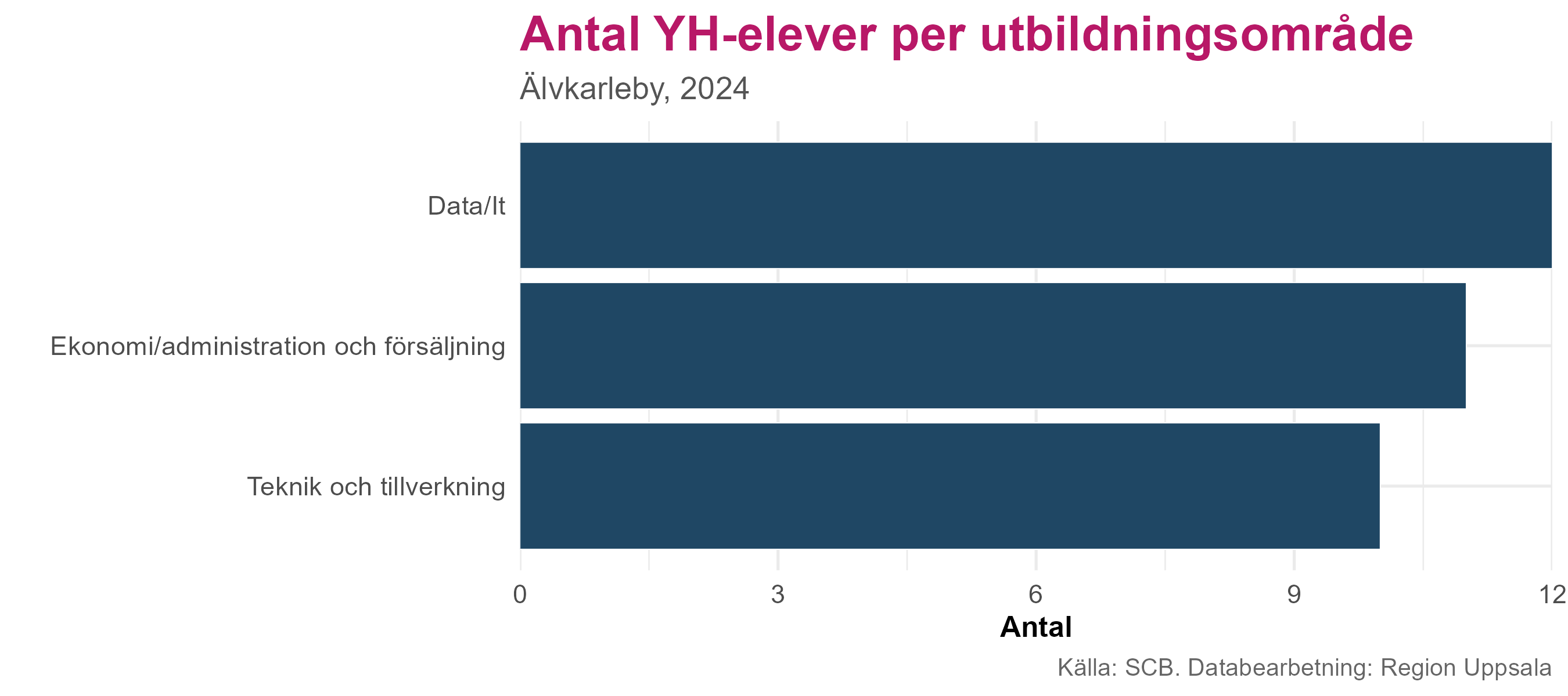 Följande statistik avser YH-elever som är folkbokförda i Uppsala län. Uppgifterna redovisas efter hemkommun, inte efter var utbildningen bedrivs. Utbildningar med färre än 10 elever redovisas inte i statistiken av sekretesskäl. Det innebär att vissa utbildningsområden kan finnas, men inte visas i statistiken.