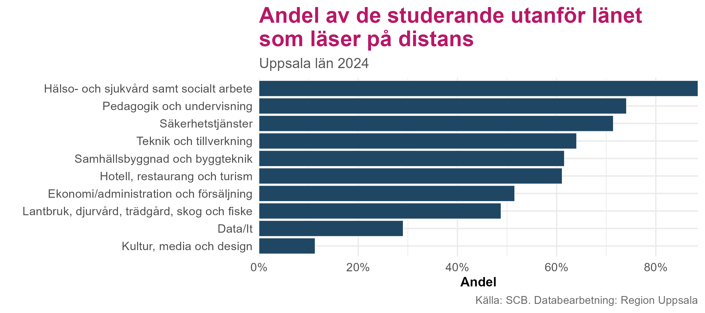 För de flesta utbildningsområden är majoriteten av de som studerar utanför länet distansstuderande. Andelen varierar dock mellan områdena och är särskilt hög inom hälso- och sjukvård samt socialt arbete och pedagogik och undervisning. Samtidigt är andelen lägre inom exempelvis kultur, media och design samt data/it.