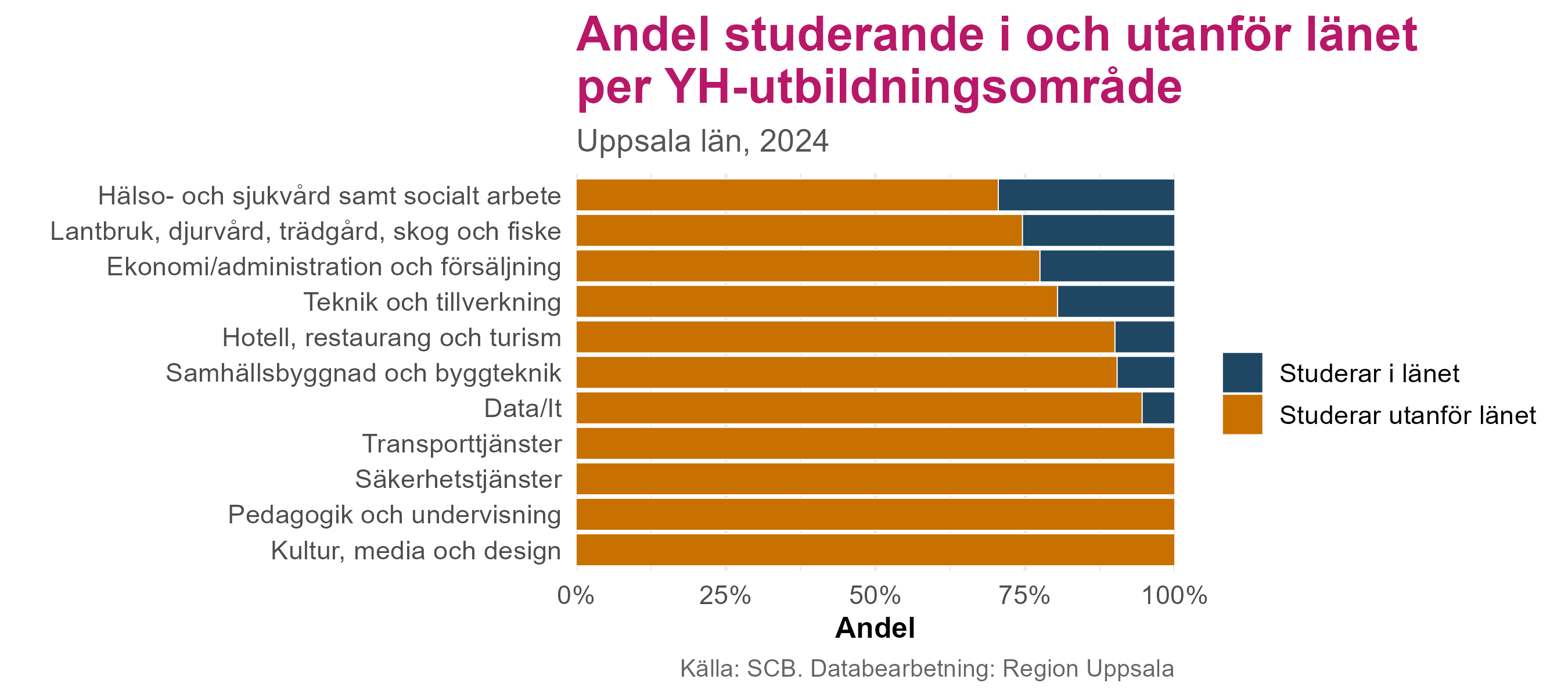 Figur 17 visar andelen YH-elever som studerar i respektive utanför länet. En tydlig majoritet av eleverna studerar utanför länet inom samtliga utbildningsområden. Samtidigt finns vissa skillnader mellan områdena. Hälso- och sjukvård samt socialt arbete utmärker sig med den högsta andelen studerande i länet, medan övriga utbildningsområden i ännu högre grad domineras av studier utanför länet. Inom flera områden, såsom transporttjänster, säkerhetstjänster, pedagogik och undervisning samt kultur, media och design, sker i princip all utbildning utanför länet.