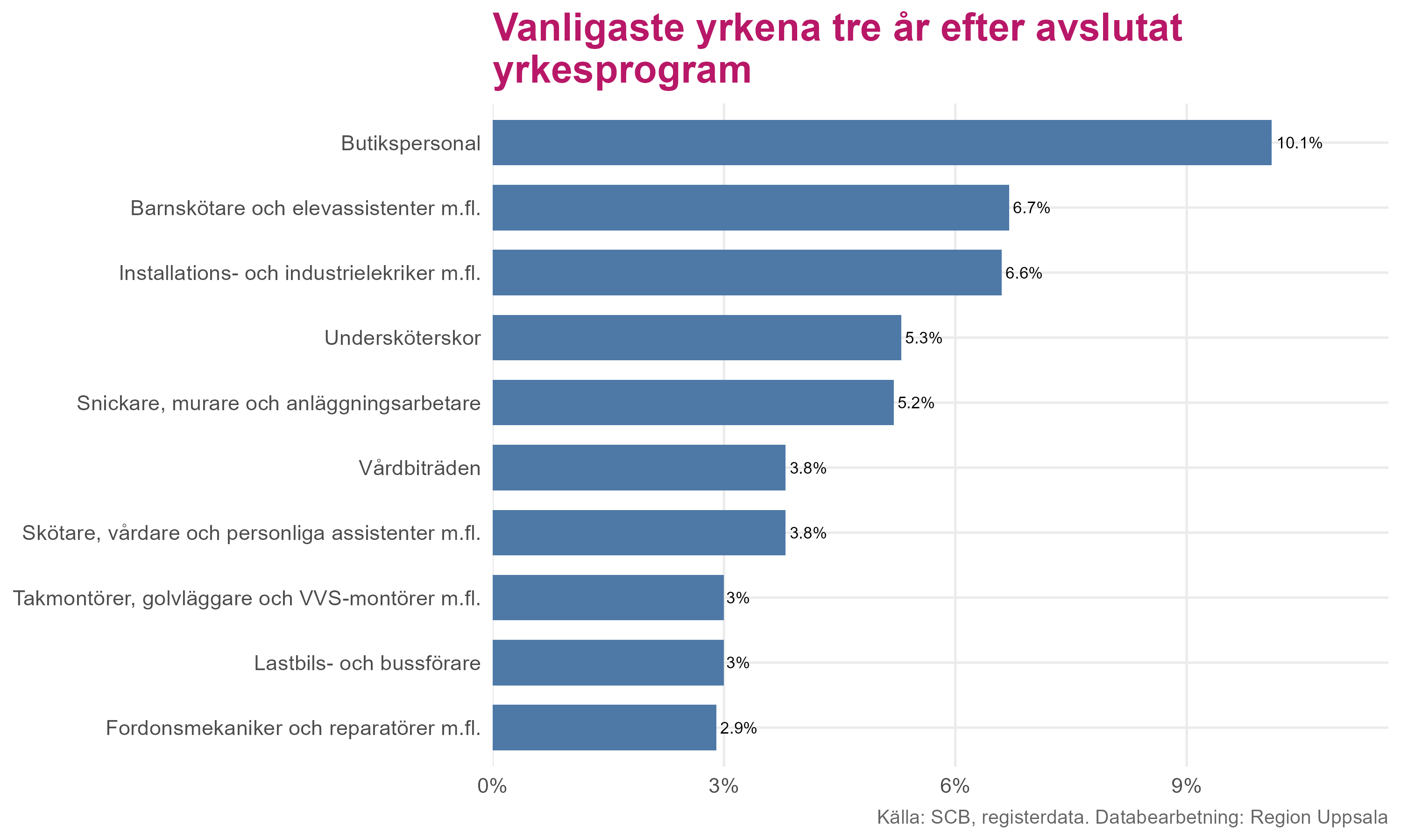 Figur 9 visar de vanligaste yrken (SSYK3) bland personer som avslutat ett yrkesprogram på gymnasiet. Tre år efter examen arbetade flest som butikspersonal (10,1 procent). Andra vanliga yrken var barnskötare och elevassistenter (6,7 procent) samt installations- och industrielektriker (6,6 procent). Även yrken som undersköterskor, snickare, murare och anläggningsarbetare förekom ofta.