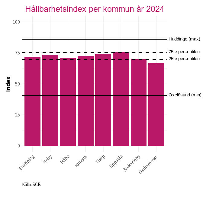 Enligt hållbarhetsindexet i Figur 3 ligger sex av länets åtta kommuner mellan den 25:e och 75:e percentilen bland landets kommuner. Uppsala, Tierp och Heby uppvisar de högsta indexvärdena, medan Östhammar, Älvkarleby och Håbo har de lägsta.