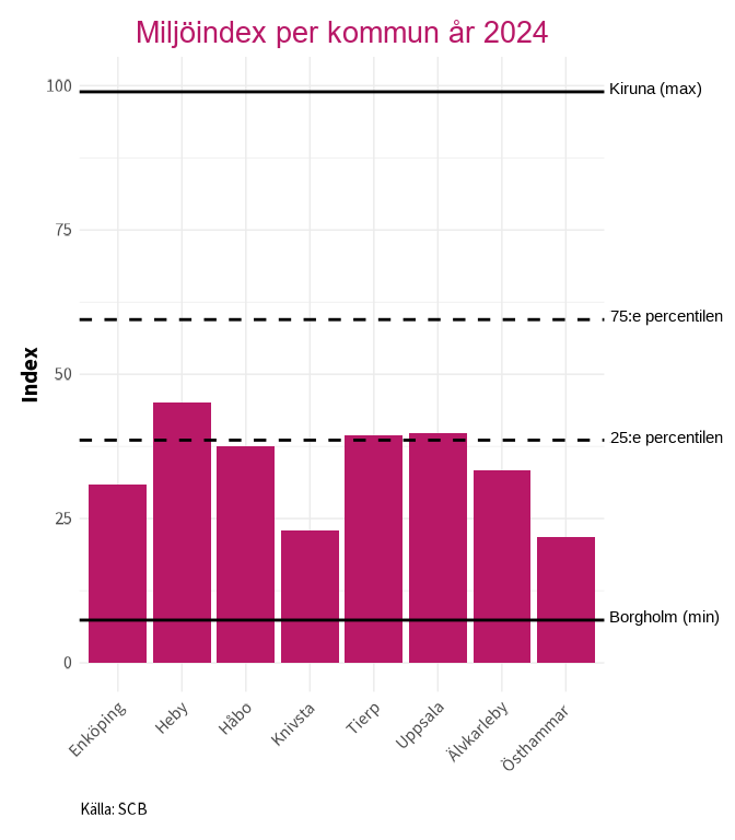 Miljökvalitetsindexet beskriver kommunernas miljötillstånd med fokus på natur- och vattenmiljöer samt tillgång till grönområden. Indexet bygger på ett urval av indikatorer som speglar både ekologisk kvalitet och närhet till natur för invånarna.